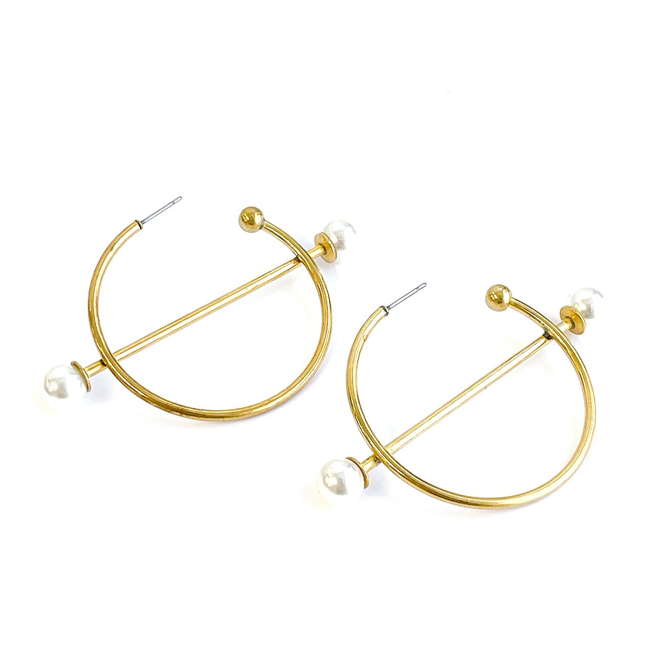 大ぶり、ユニークで大胆、存在感あるパール付きフープスタイルのチタン芯ピアスです。顔まわりでポイントなる大ぶりなデザインが魅力的なデザインです。カジュアルな服装にはポイントになるアクセサリーとしてお出かけのスタイリングには主役になるアクセサリーとして。