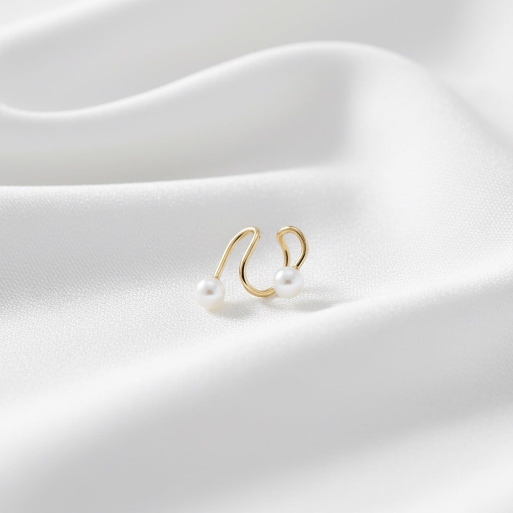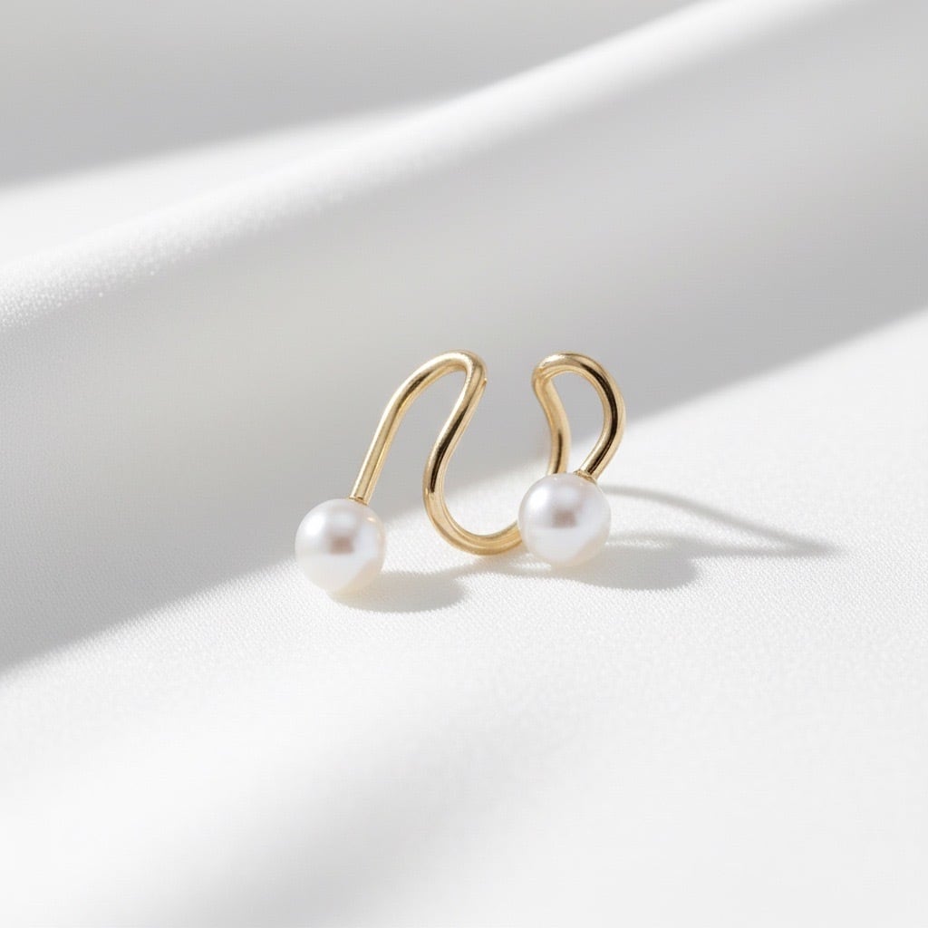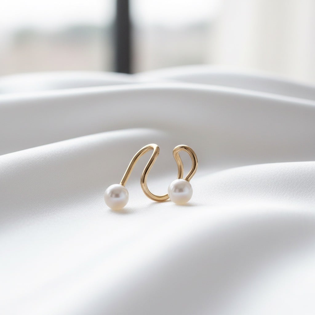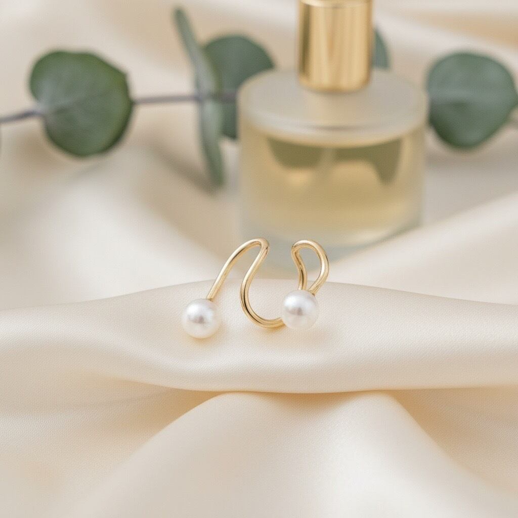 エレガントな曲線が個性的なパール付きイヤーカフです。金色の流線型の曲線が耳に優しくフィットし、それぞれのカフには光沢のあるパールが飾られています。シンプルながらも高級感があり、さりげない豪華さを演出してくれるアイテムです。