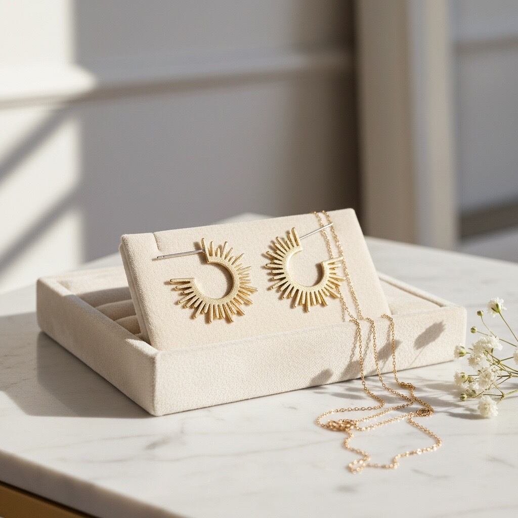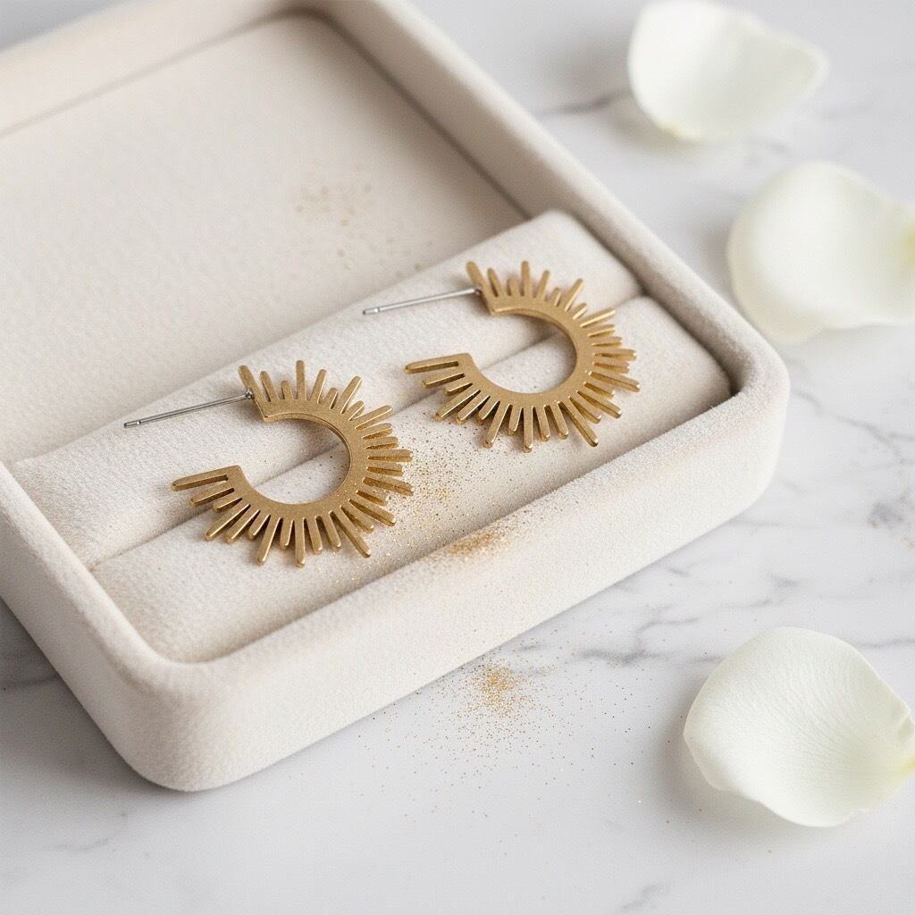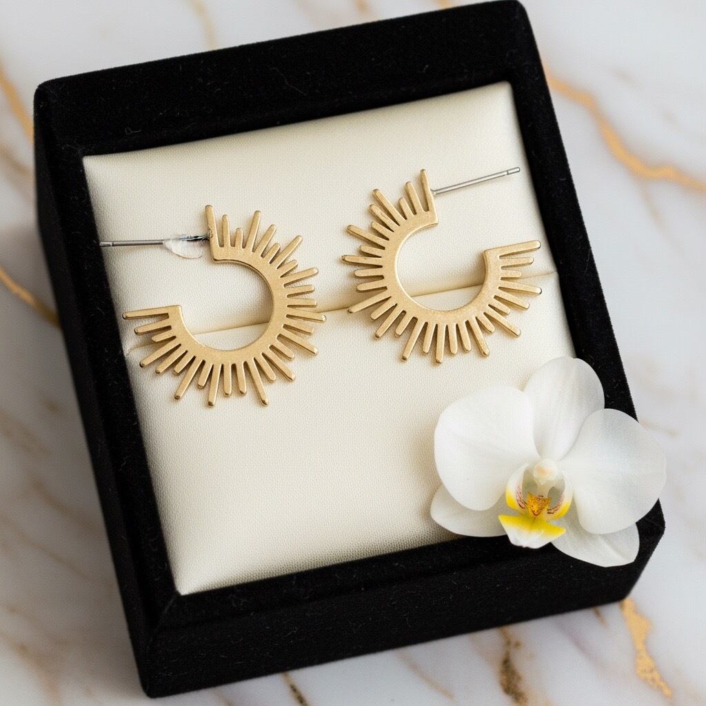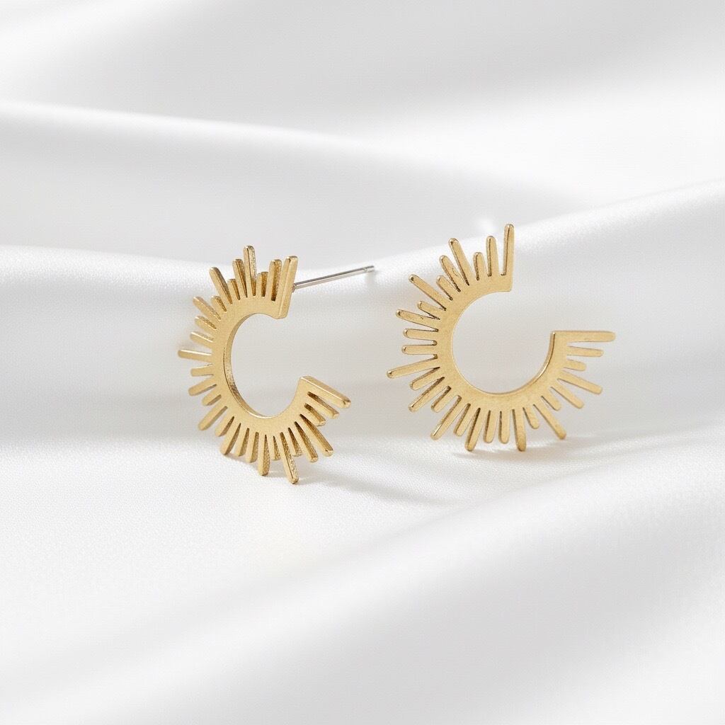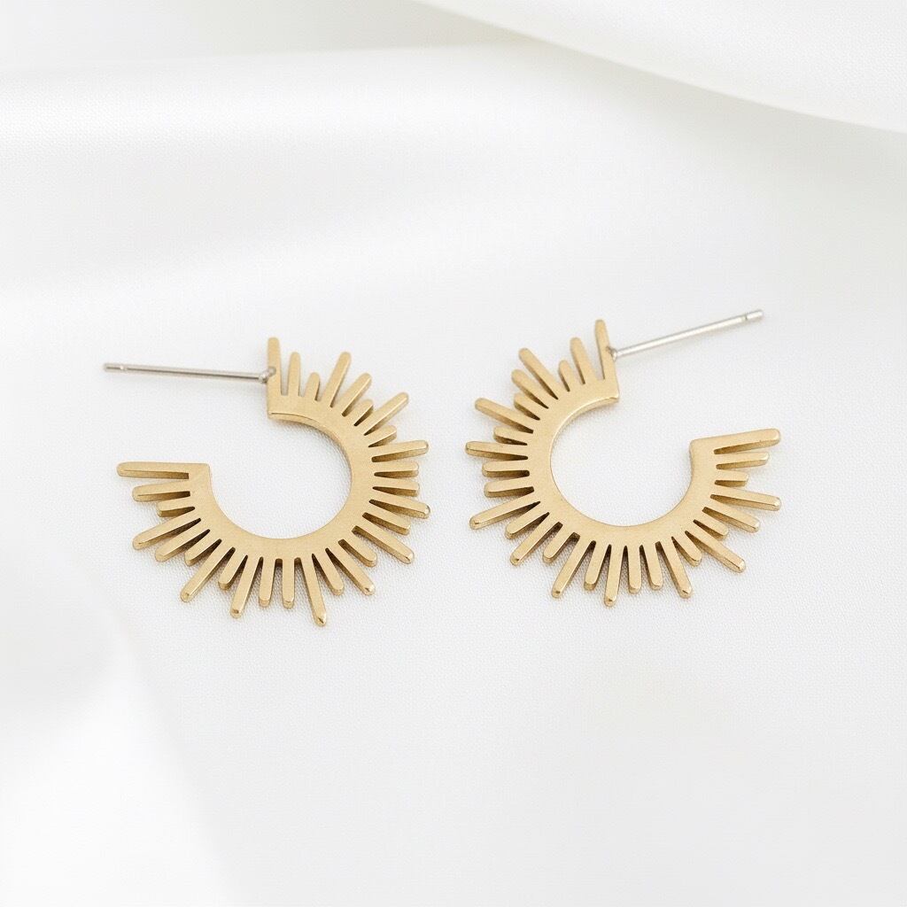 太陽を模した斬新なデザインが魅力のフープピアスです。ジオメトリックな形状がモダンな印象を与える一方で、温かみのある色合いが柔らかな女性らしさを引き立てます。大人の魅力を引き立てるアクセントとして、派手すぎず、でも存在感のあるアクセサリーとして、カジュアルから、エレガントなスタイルまで幅広いシーンでご愛用いただけます。