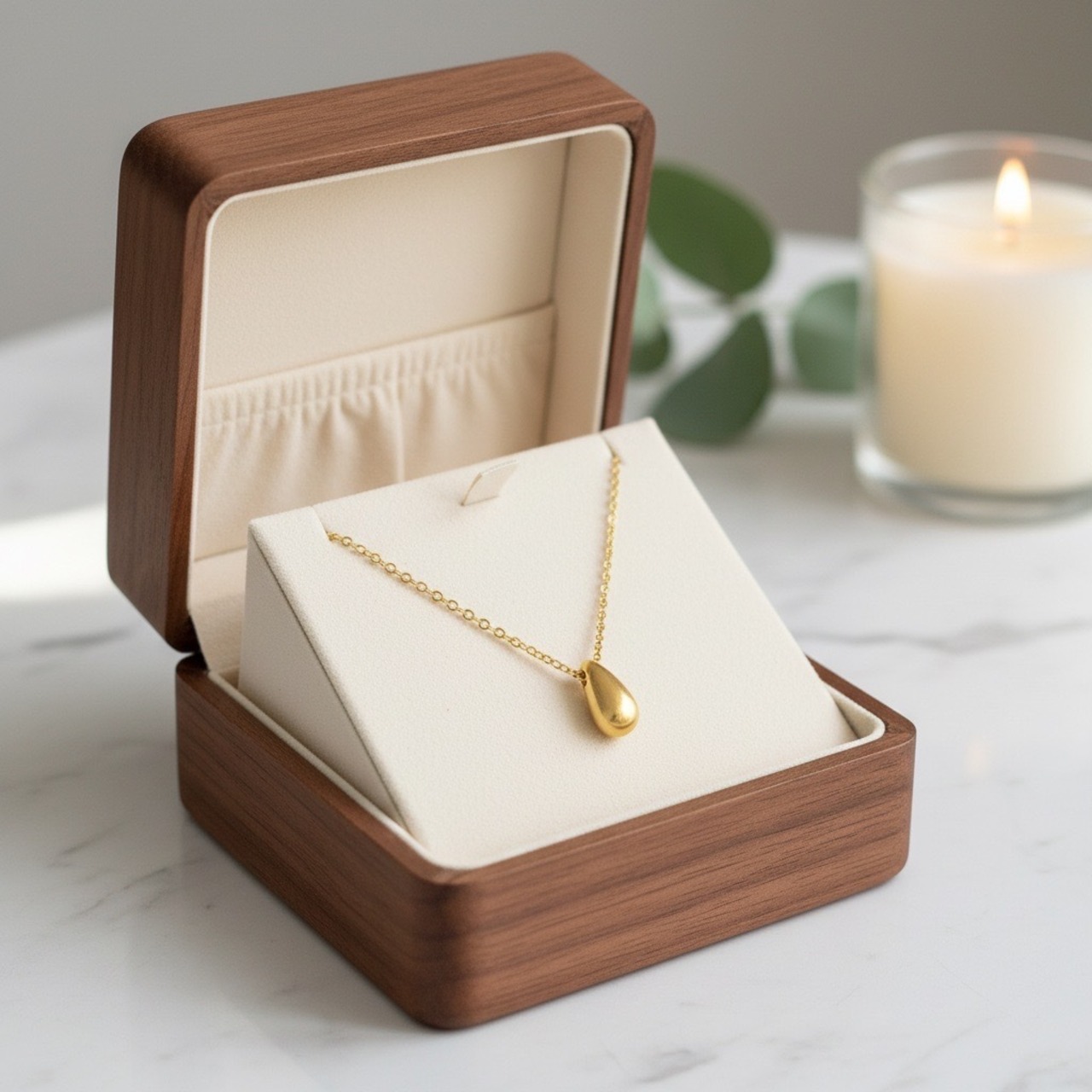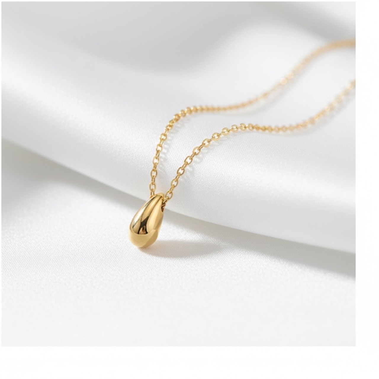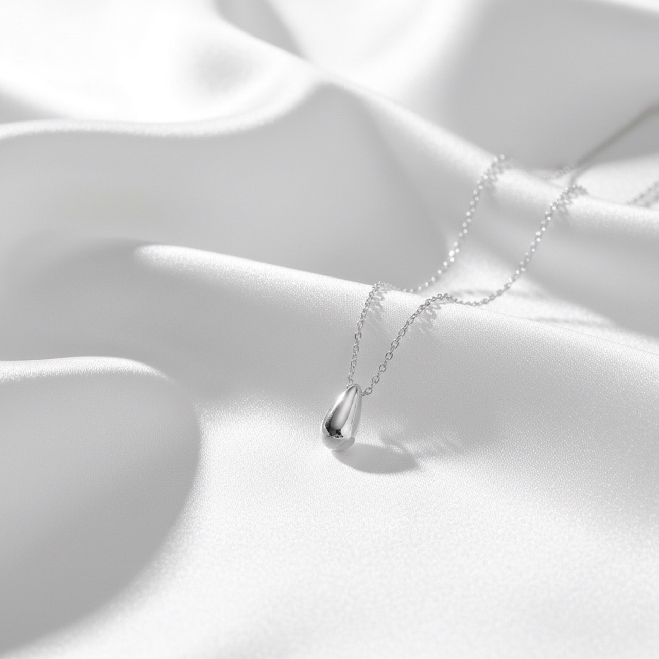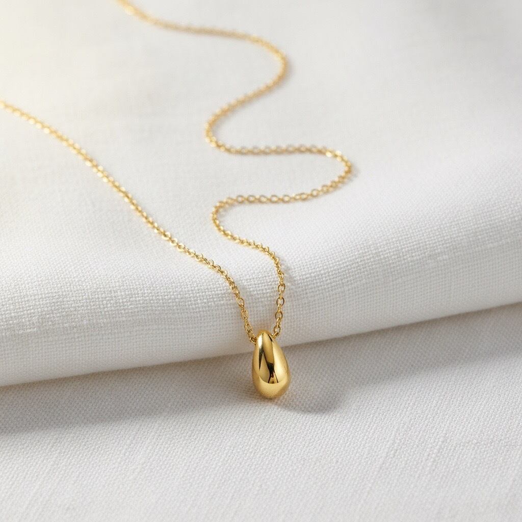 しずくがそっと流れ落ちるような、なめらかなフォルムが美しいドロップモチーフネックレス。