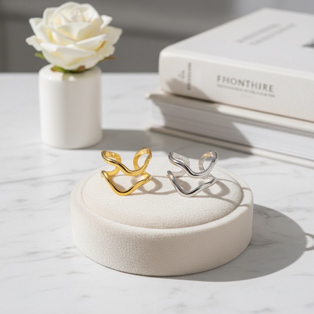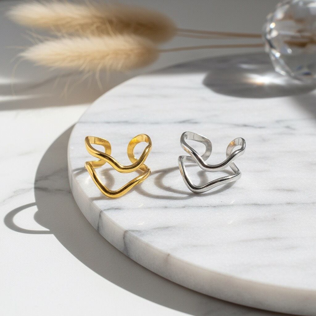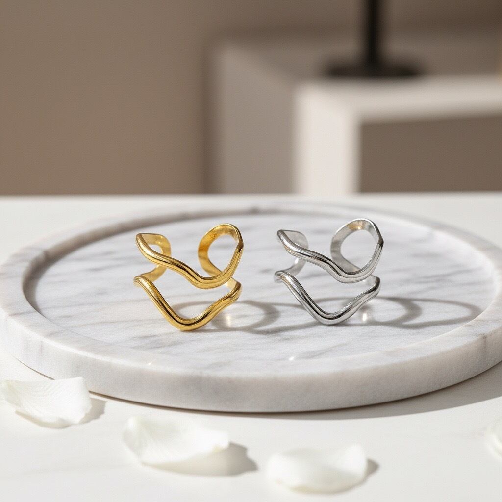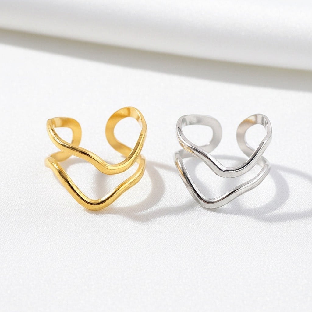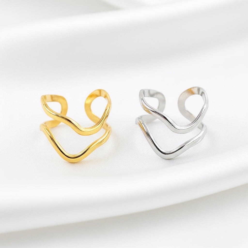 流れるような曲線が幾重にも重なり、指元に自然な動きと立体感をもたらすオープンリング。やわらかなラインが肌になじみ、シンプルでありながら印象的な存在感を演出します。ゴールドとシルバーの2色展開で、カジュアルからきれいめ、モードスタイルまで幅広いコーディネートに対応します。主張しすぎないデザインながら、手元に洗練されたニュアンスを添えてくれる大人のためのリングです。