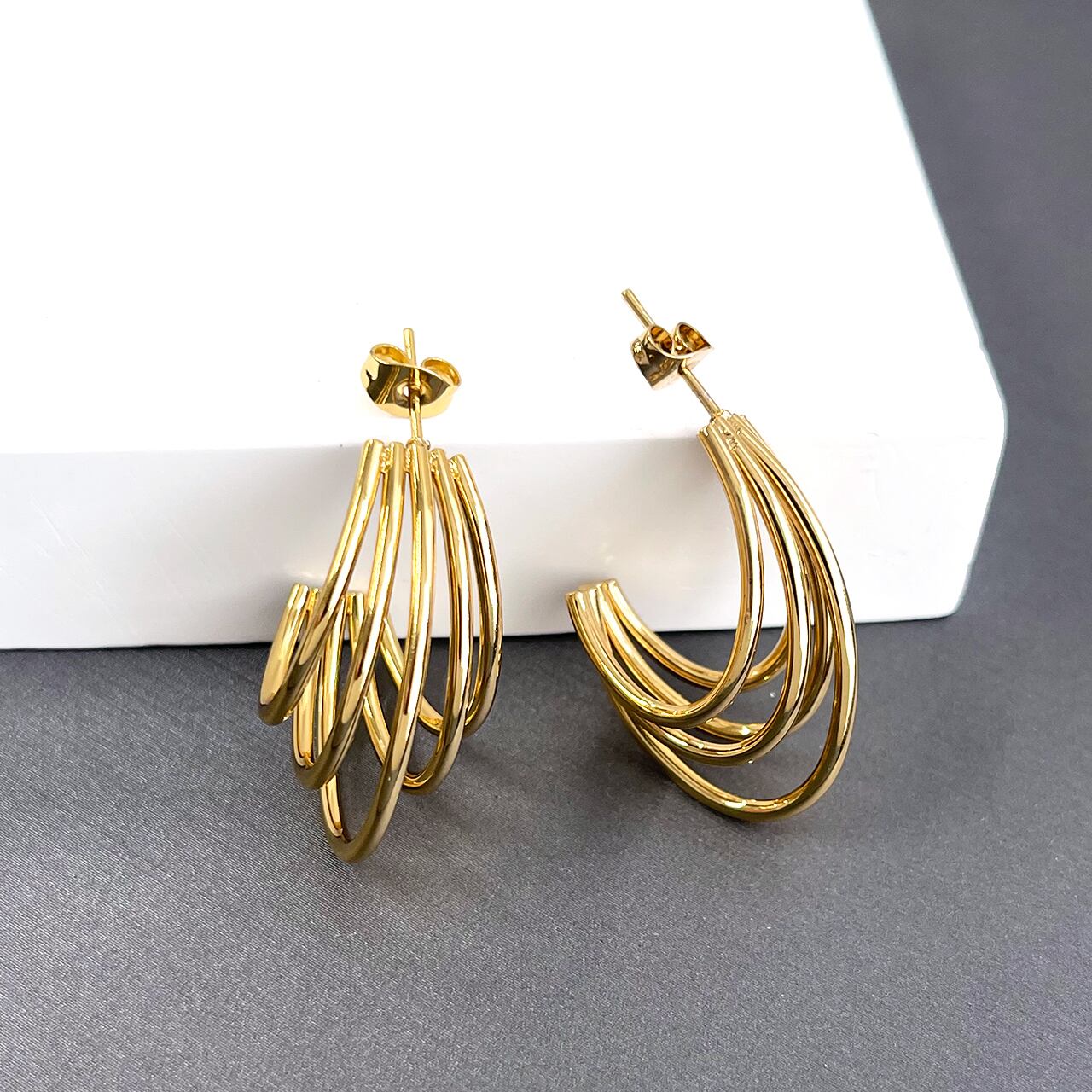 複数のレイヤーが美しい曲線を描く、モダンなデザインのフープピアス。ゴールドとシルバーのカラー展開で、どちらも高級感と洗練された印象を与えます。ユニークな形状が耳元にボリューム感をプラスし、日常のコーディネートから特別なシーンまで幅広く活躍します。