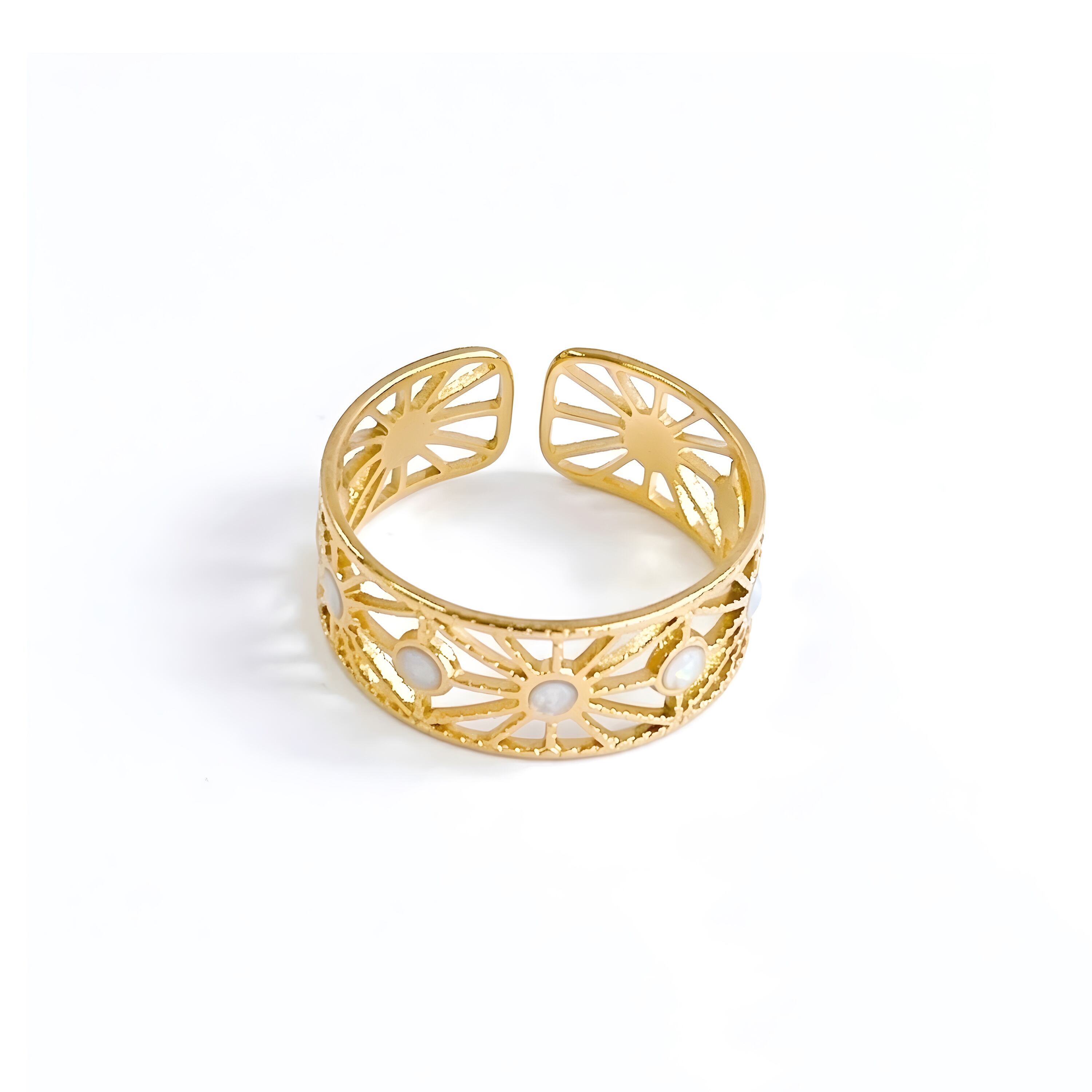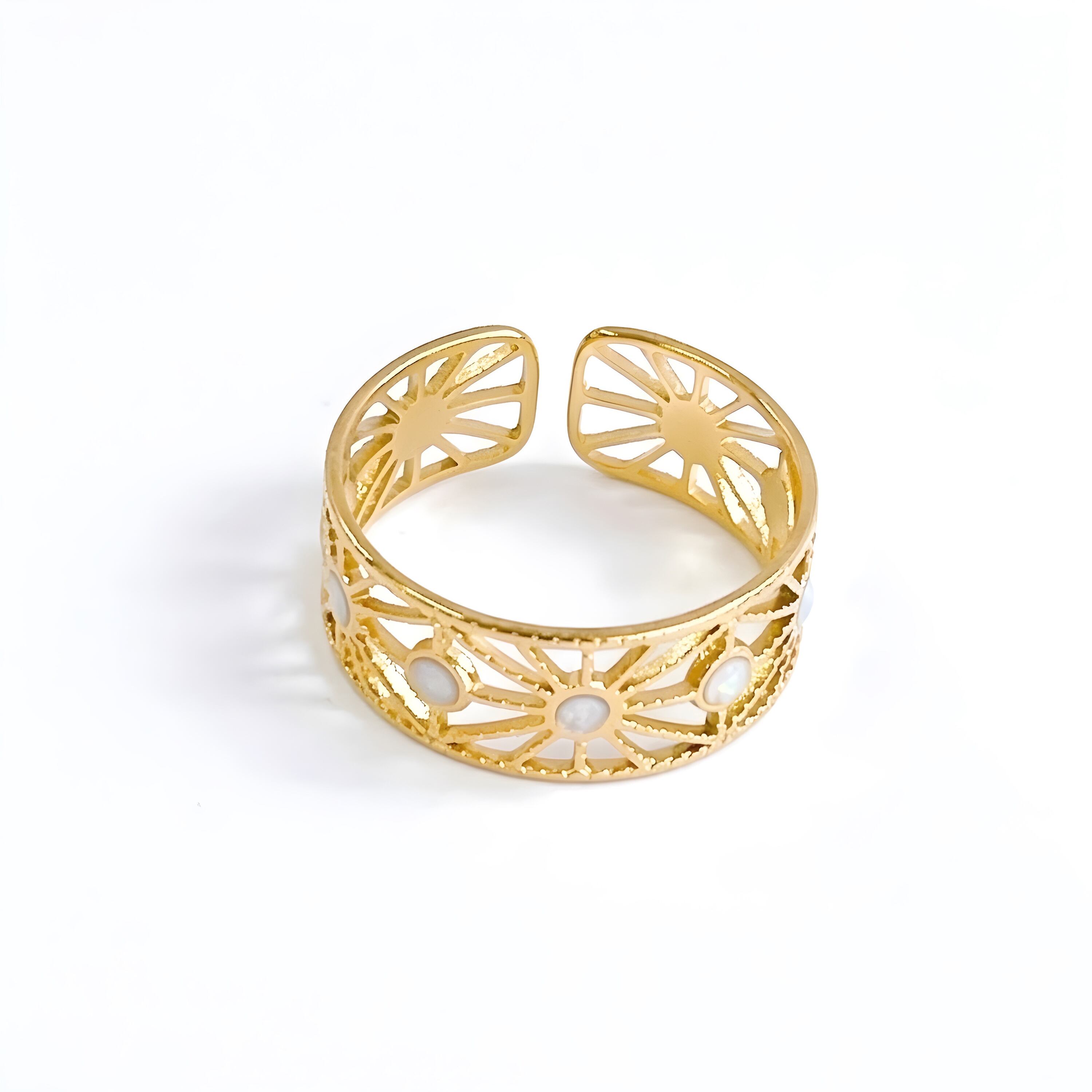 指にやさしくフィットするオープンリングは、わずかなサイズ調整が可能です。無理なく優しく広げたり閉じたりすることで、お好みのフィット感に調整いただけます。