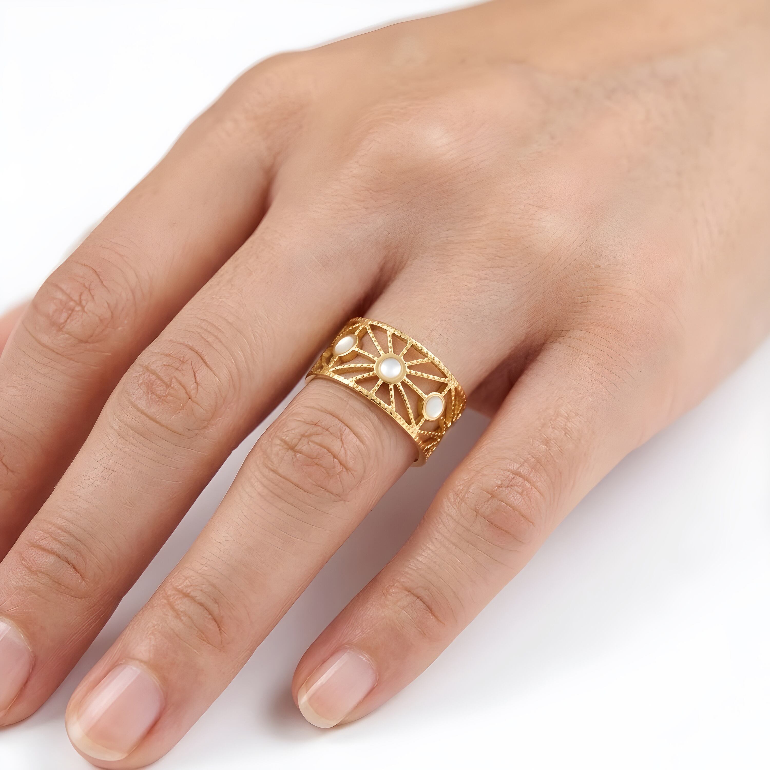 洗練されたフィリグリーデザインに、ブラックとホワイトのエナメル加工が施されたドット模様が特徴の2色展開のゴールドリング。ドット模様がアクセントとなり、ゴールドの輝きとのコントラストが美しく、指元を華やかに彩ります。