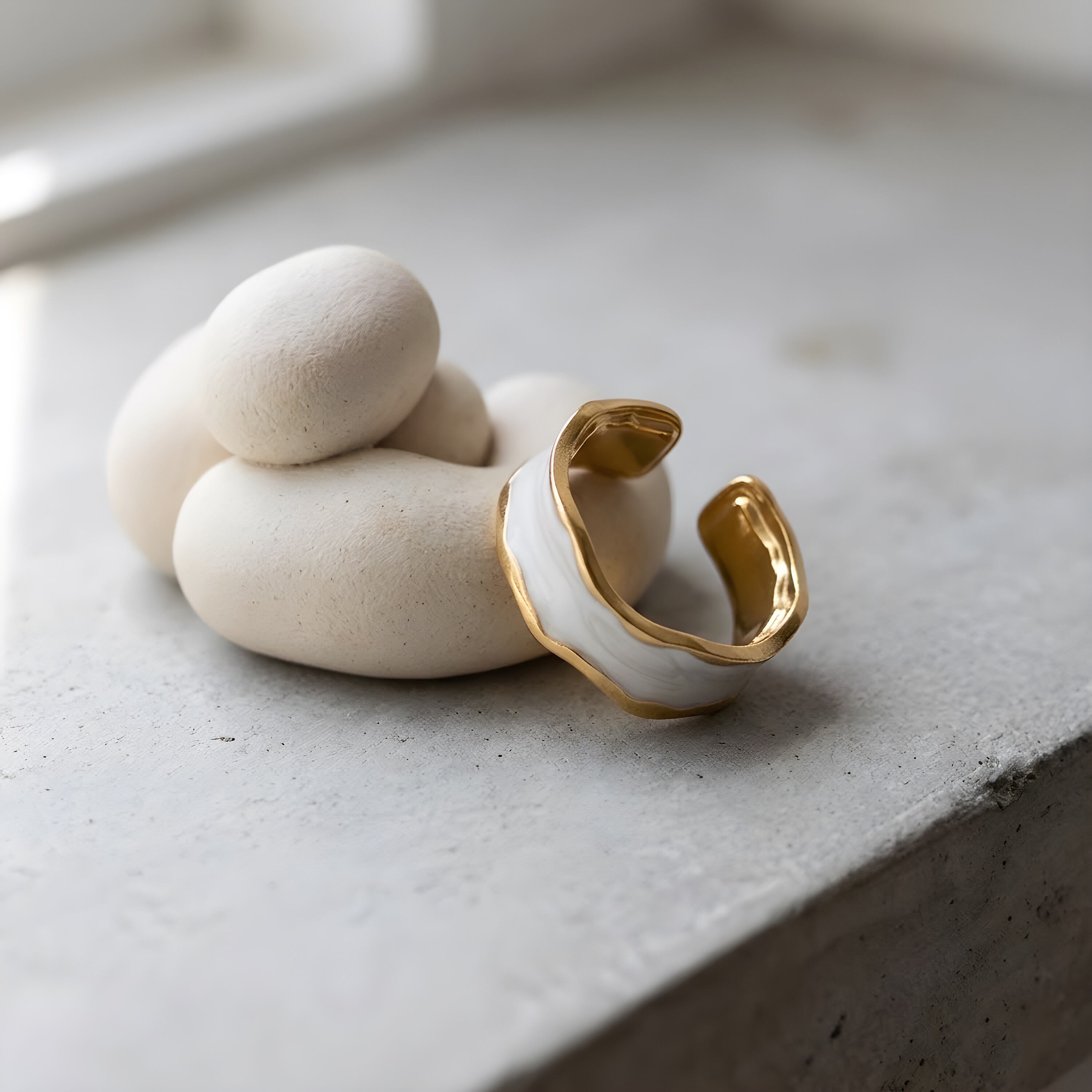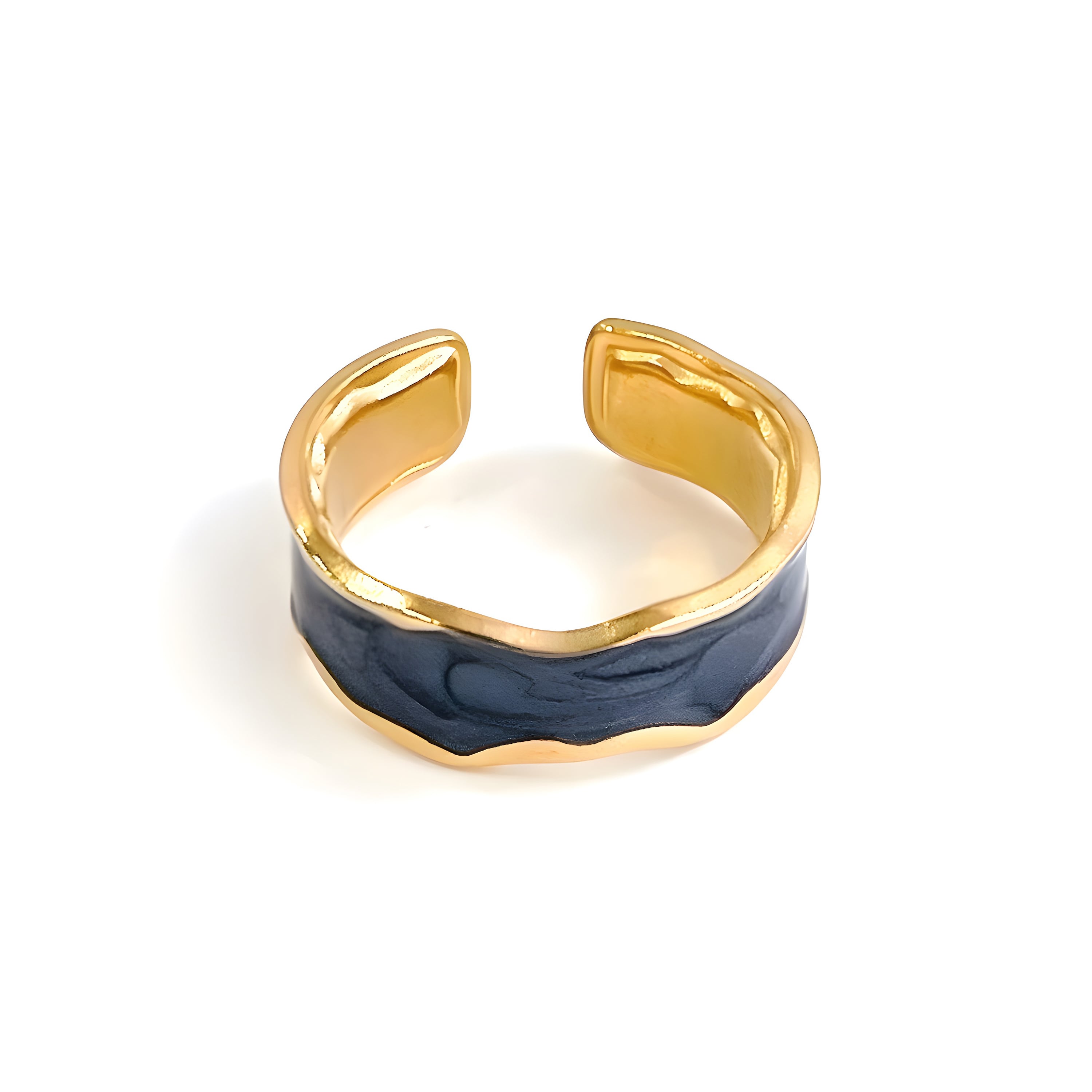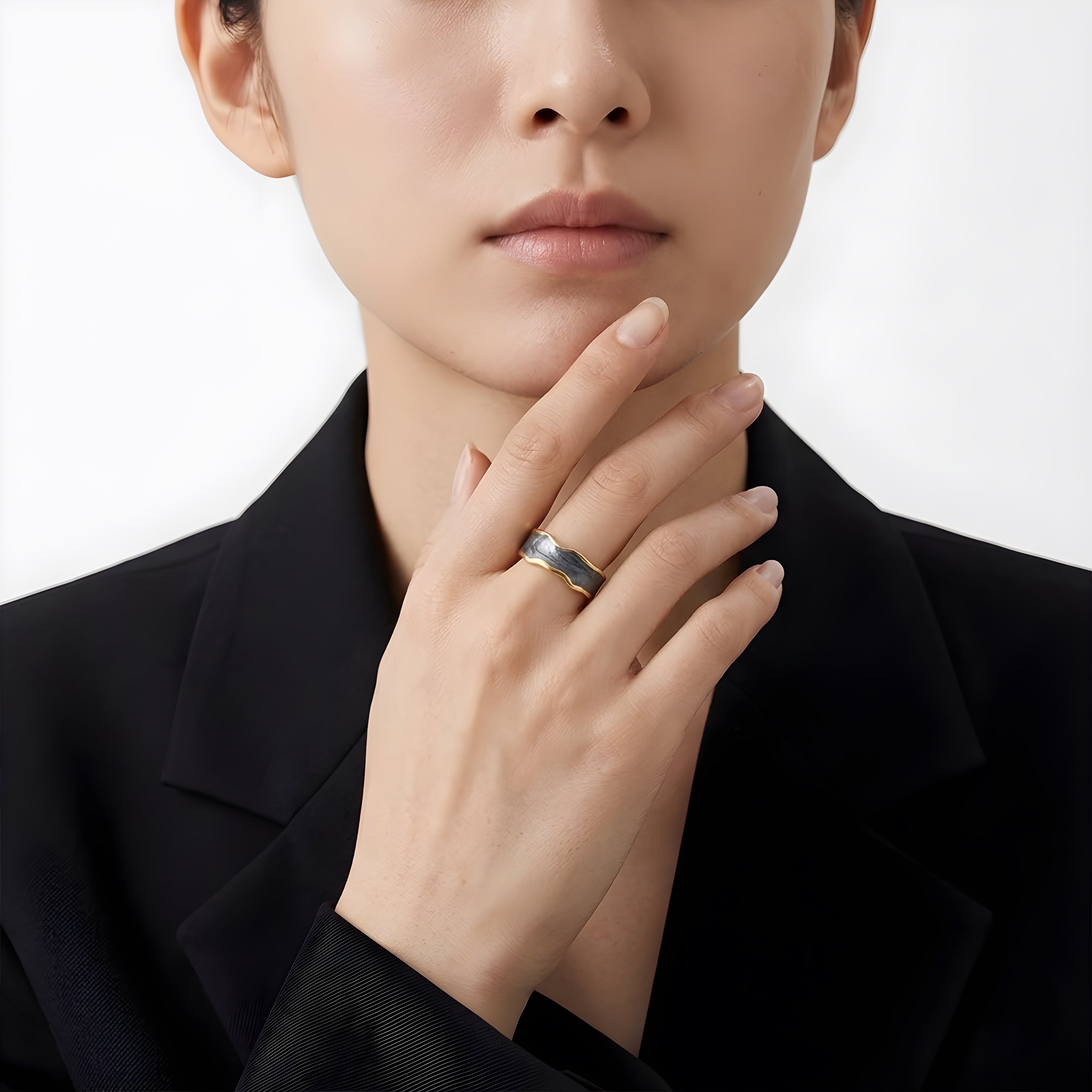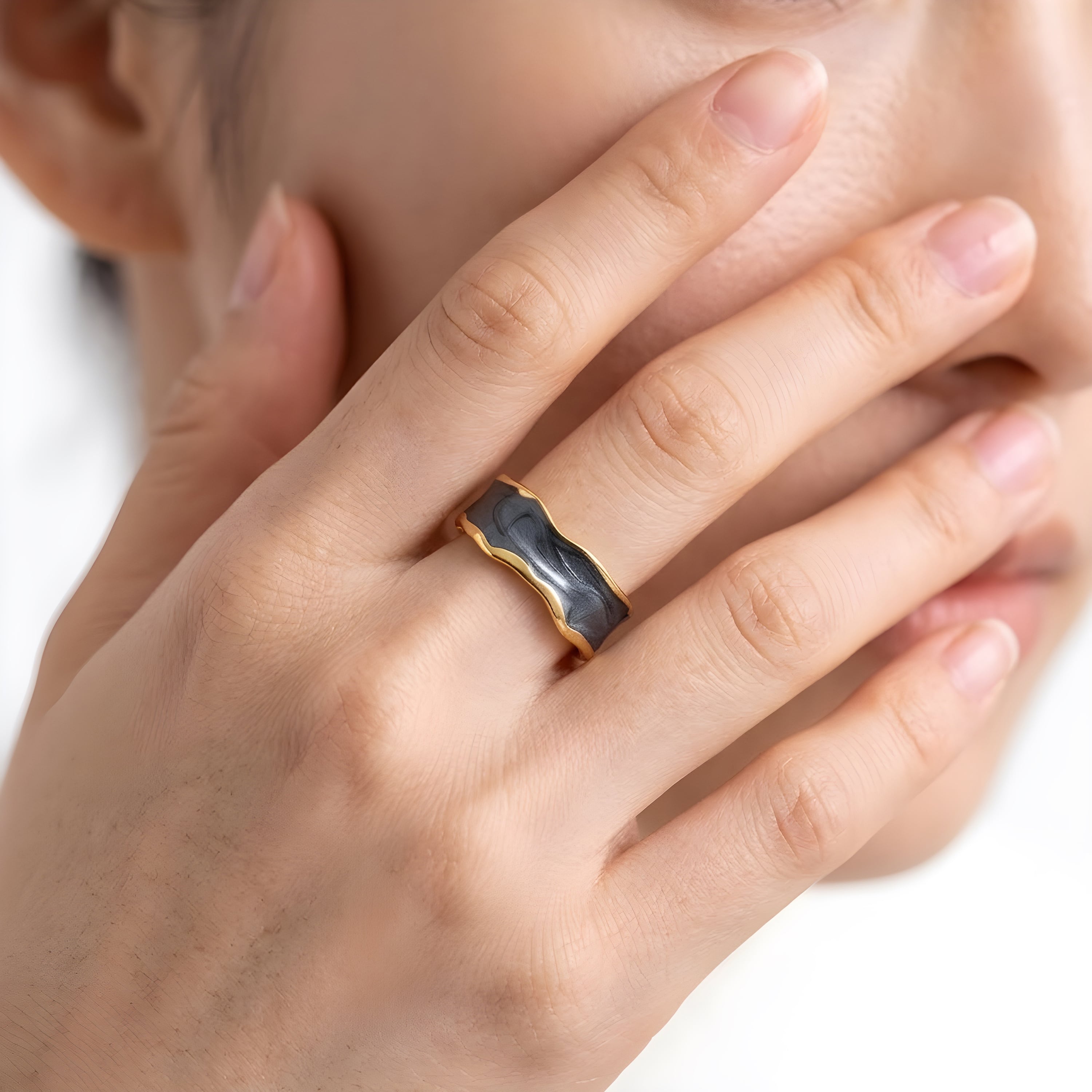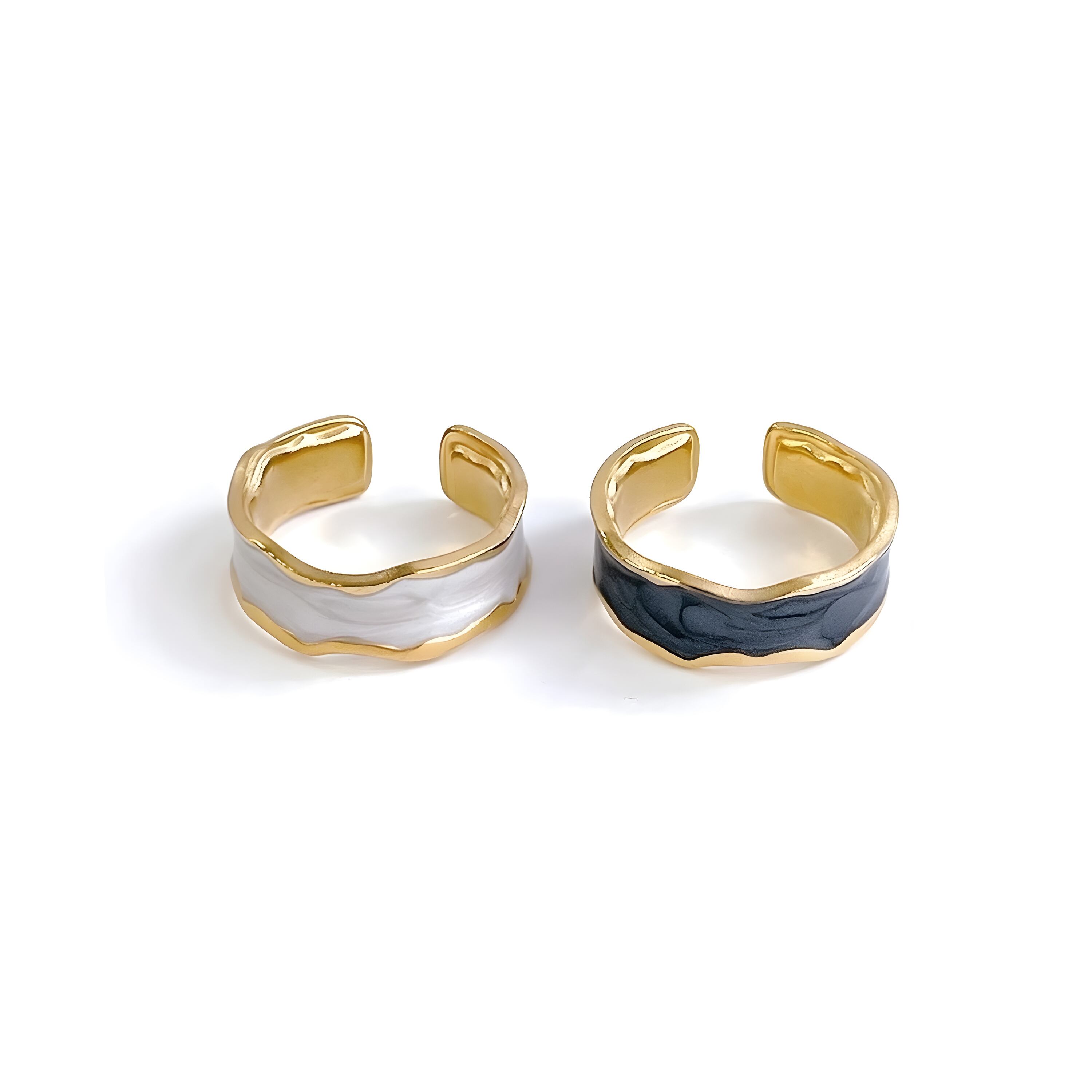 大胆なカラーエナメル加工が特徴の2色展開のステンレスリング。ゴールドのベースに、ブラックとホワイトのエナメルが波打つようなデザインで施され、ユニークで洗練された印象を与えます。モダンなデザインとカラーリングが際立ち、コーディネートにアクセントを加えたい方におすすめです。日常使いはもちろん、特別なシーンでも映えるデザインで、シンプルな装いに個性的な輝きをプラスします。