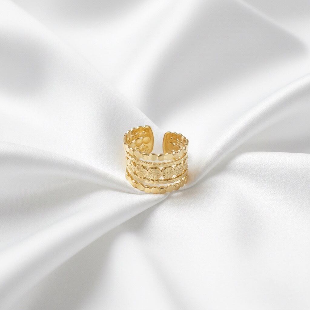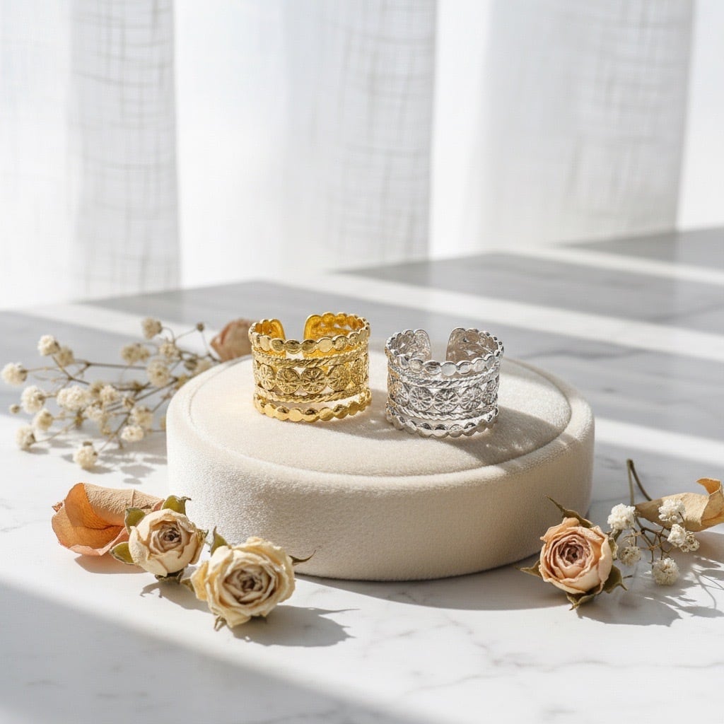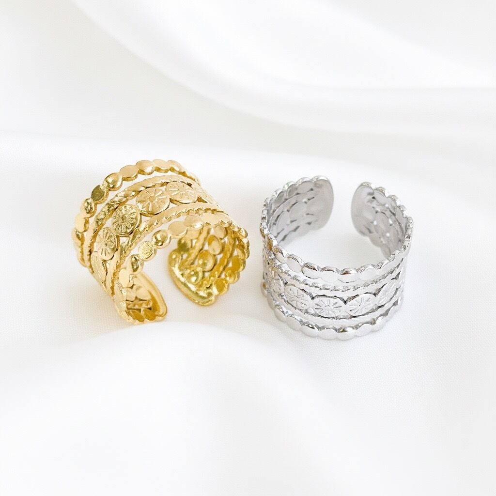 ヴィンテージ風の華やかなデザインが特徴的なリングです。幅広のバンドに施された繊細な模様が印象的で、どこかレトロで高級感を感じさせます。ゴールドとシルバーの2色展開で、スタイリングに合わせて選べる点も嬉しいポイント。指にしっかりフィットしつつも軽やかな着け心地です。お手元に華やかさをプラスしたい方におすすめです。