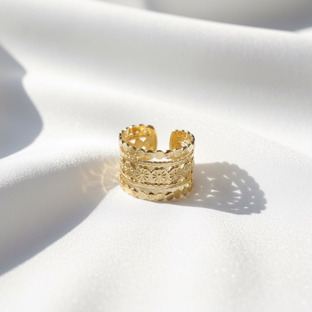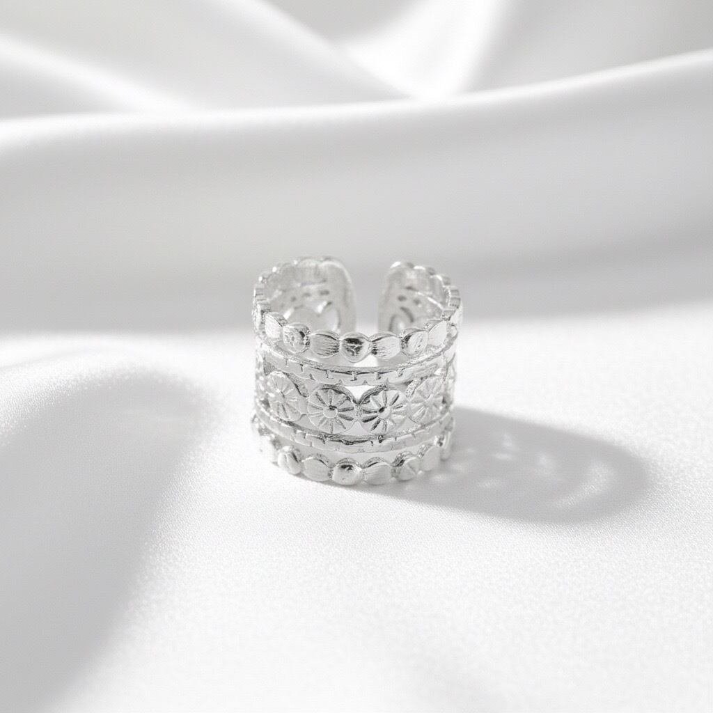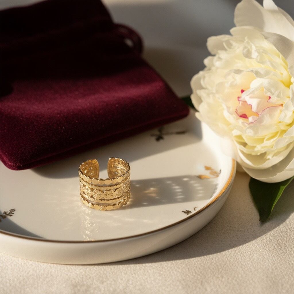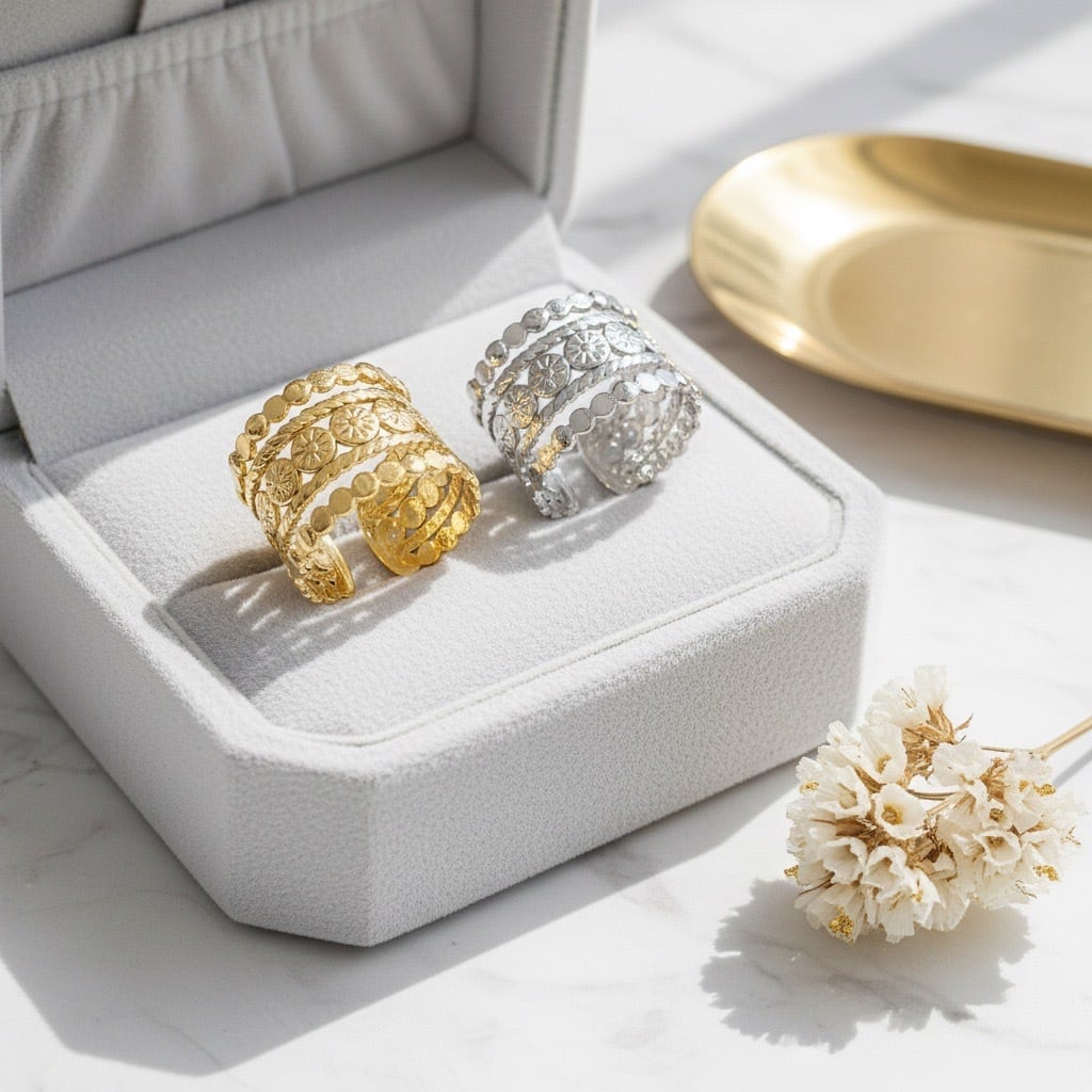ヴィンテージ風の華やかなデザインが特徴的なリングです。幅広のバンドに施された繊細な模様が印象的で、どこかレトロで高級感を感じさせます。ゴールドとシルバーの2色展開で、スタイリングに合わせて選べる点も嬉しいポイント。指にしっかりフィットしつつも軽やかな着け心地です。お手元に華やかさをプラスしたい方におすすめです。