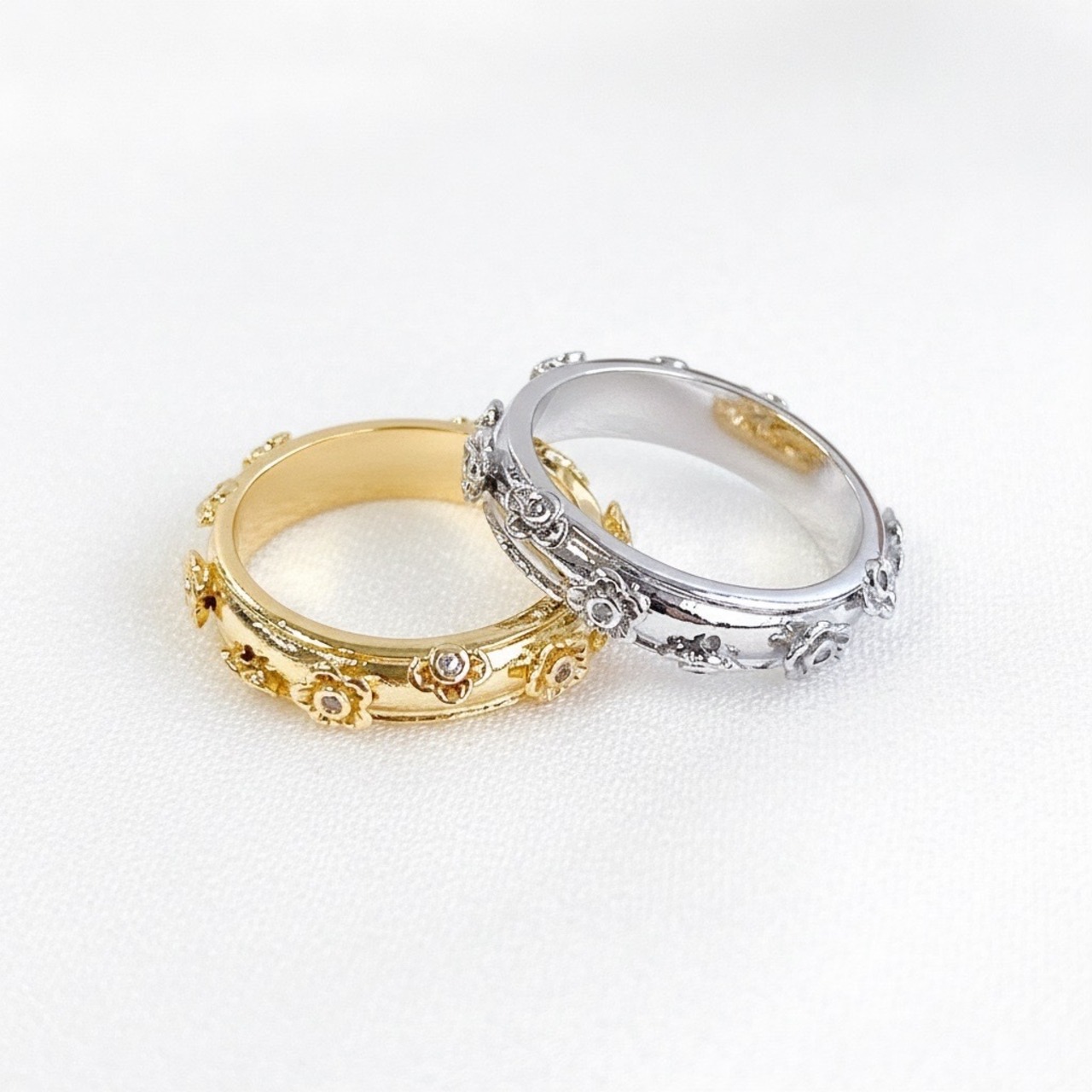 繊細なフラワーモチーフとキュービックジルコニアがあしらわれた華やかなステンレスリング。花びらのディテールがリング全体を囲み、キラリと輝くストーンが上品さを引き立てます。存在感がありながらもエレガントなデザインは、日常使いから特別なシーンまで幅広く活躍します。ゴールドとシルバーの2色展開で、どちらも魅力的な輝きを放ちます。