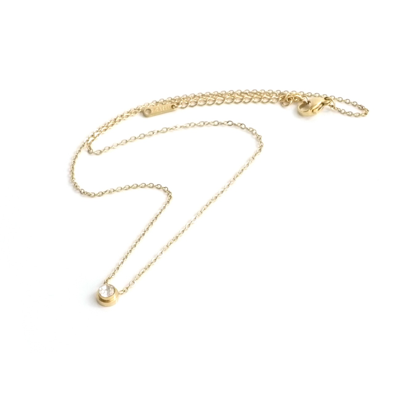 洗練されたデザインの一粒ゴールドサージカルステンレス製ネックレス。厳選されたキュービックジルコニアが美しく輝き、シンプルながらも存在感があります。おしゃれな女性にぴったりのアイテムで、日常使いから特別なシーンまで幅広く活躍します。上品でありながらも、どんなコーディネートにも合わせやすい万能なアクセサリーです。