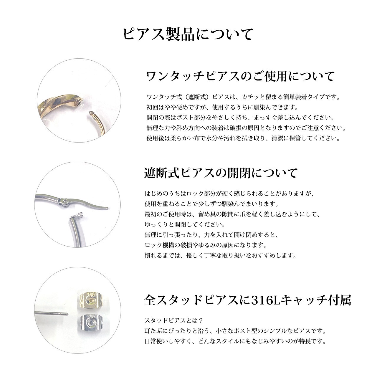 ・素材:サージカルステンレス 316L(金属アレルギーに配慮したサージカルステンレス(316L)を使用。水や汗に強く、つけっぱなしにもおすすめのアイテムです。)
