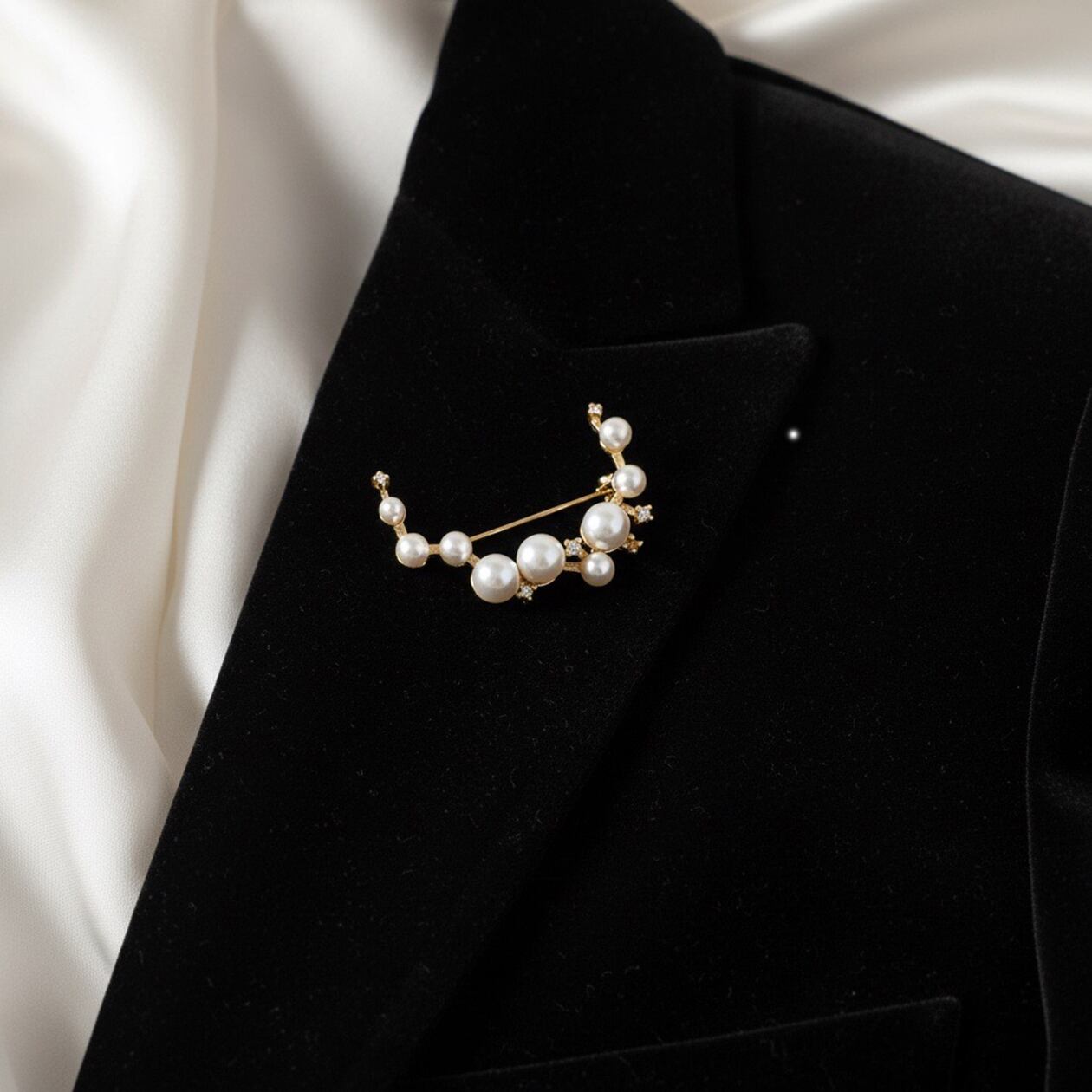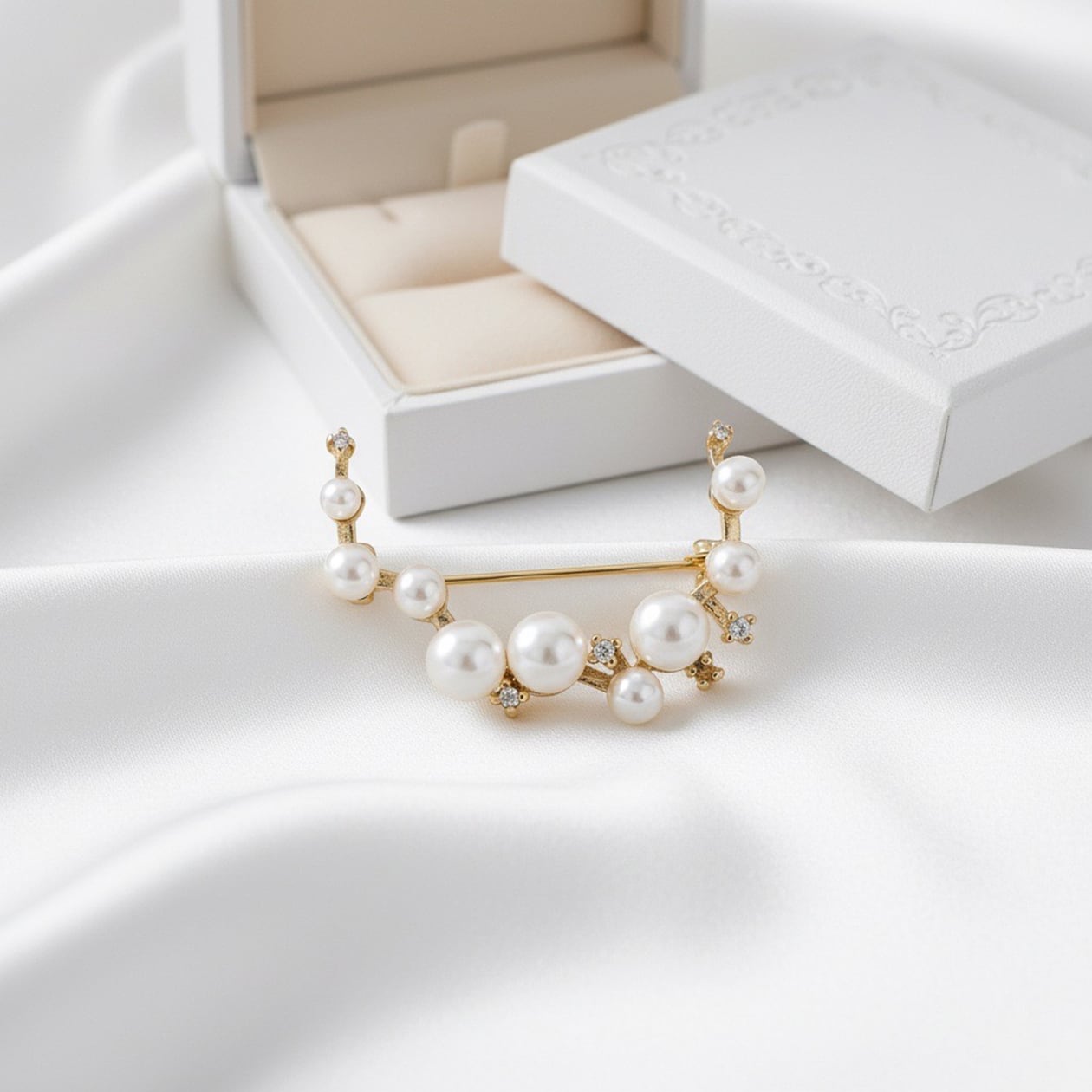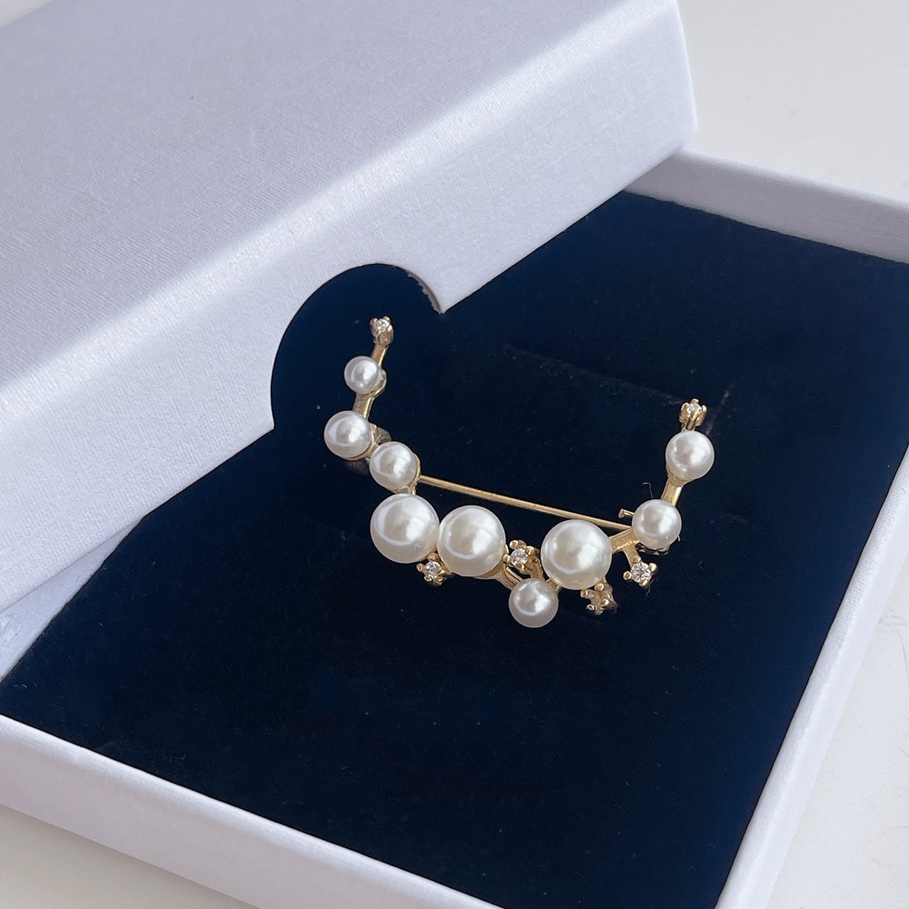 大小のパールがリズミカルに配置された「ルミナスパールブローチ」。アンティーク調のゴールド仕上げにキュービックジルコニアの煌めきがアクセントとなり、上品で華やかな印象を与えます。柔らかなパールの光沢と繊細な輝きが調和し、エレガントな大人の装いを引き立てる一品です。フォーマルなシーンや特別な日の装いにぴったり。ジャケットやストール、ワンピースに添えることで、洗練されたアクセントとして活躍します。