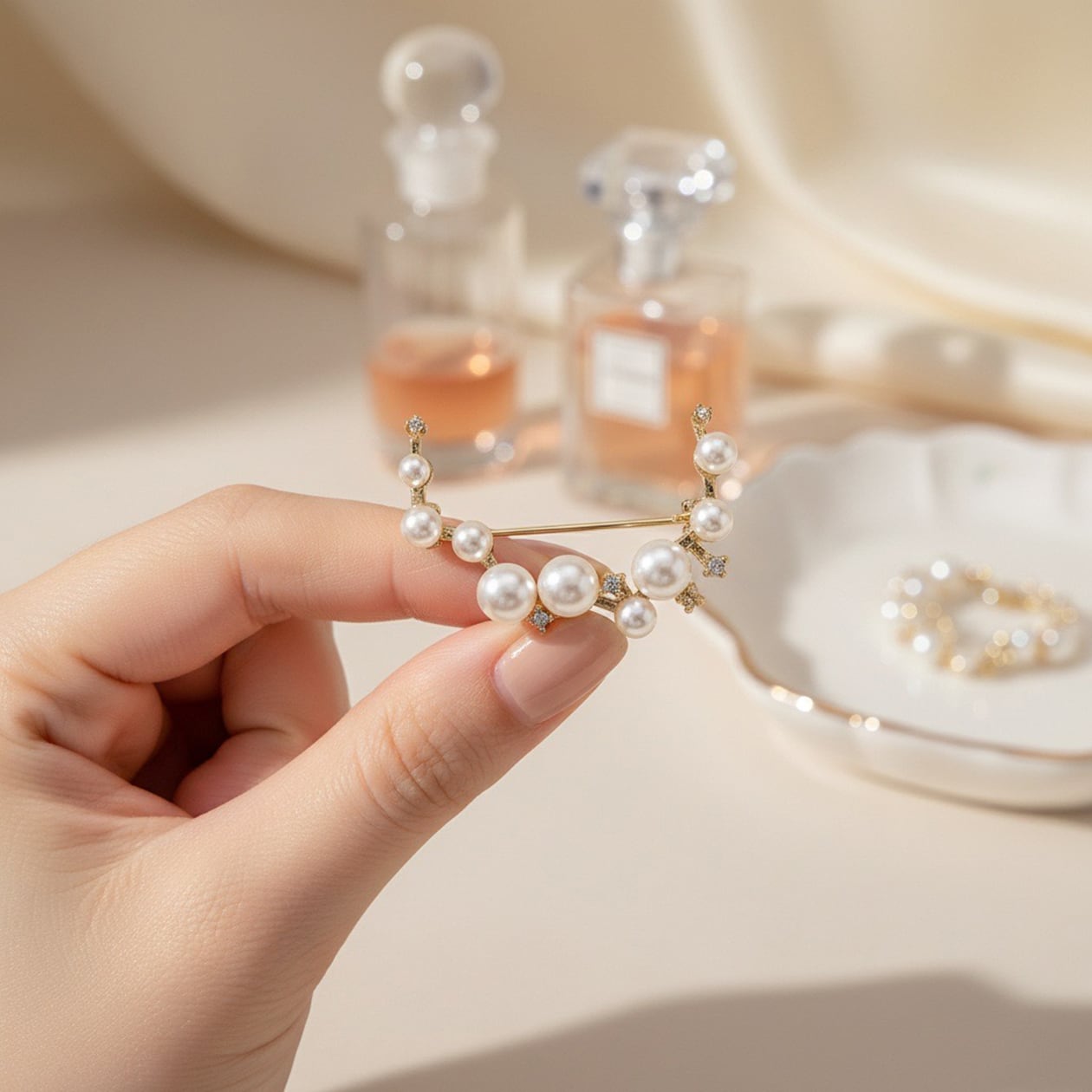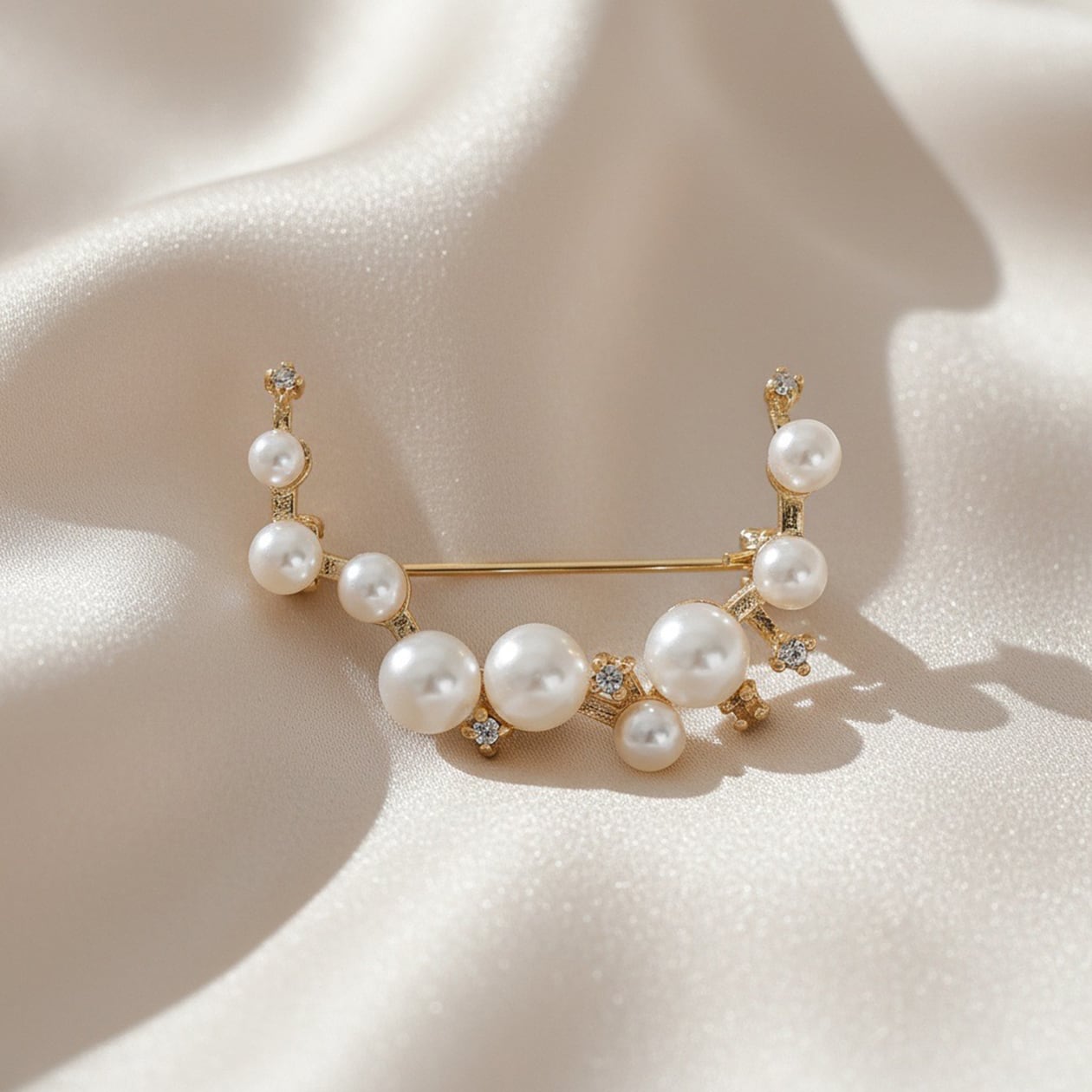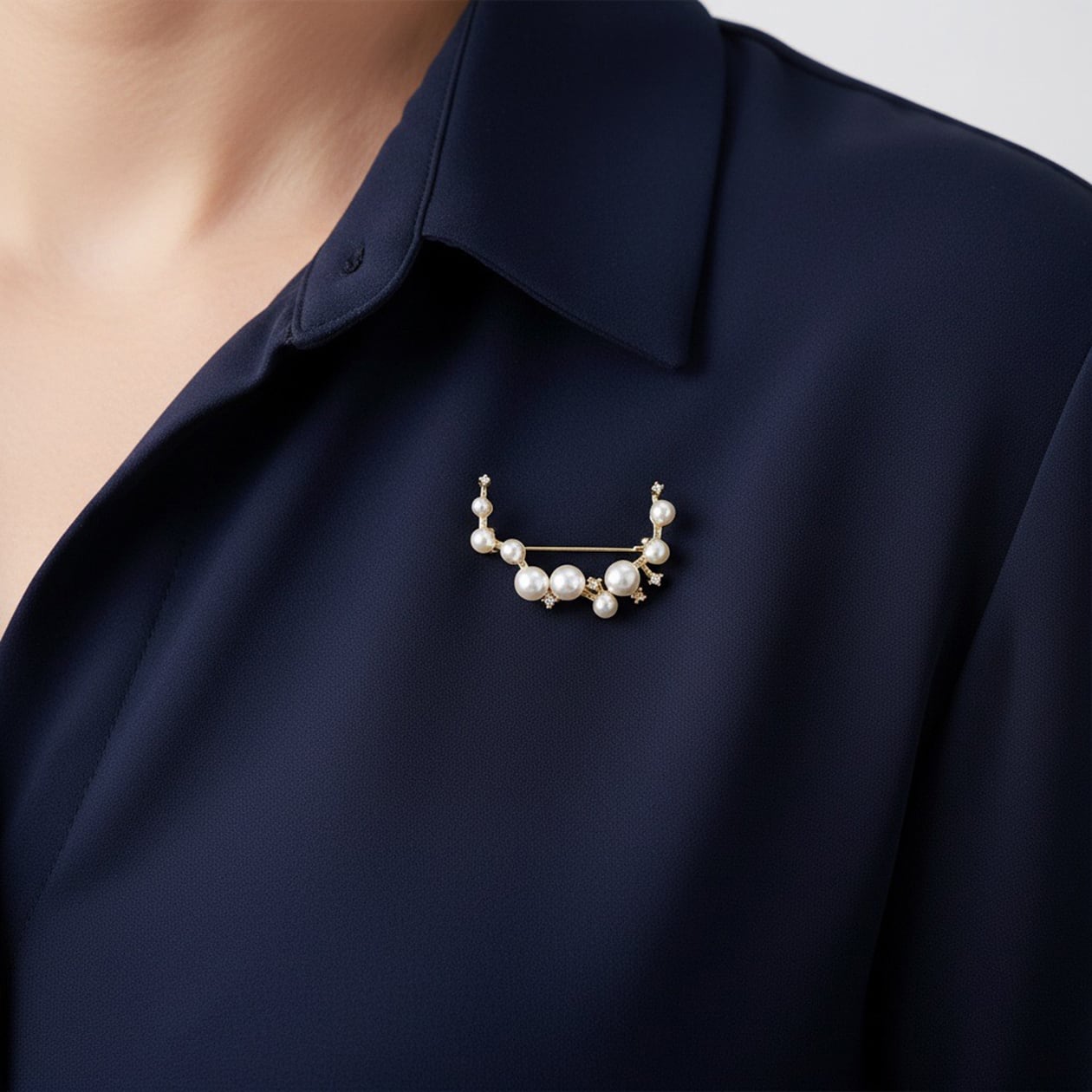 大小のパールがリズミカルに配置された「ルミナスパールブローチ」。アンティーク調のゴールド仕上げにキュービックジルコニアの煌めきがアクセントとなり、上品で華やかな印象を与えます。柔らかなパールの光沢と繊細な輝きが調和し、エレガントな大人の装いを引き立てる一品です。フォーマルなシーンや特別な日の装いにぴったり。ジャケットやストール、ワンピースに添えることで、洗練されたアクセントとして活躍します。