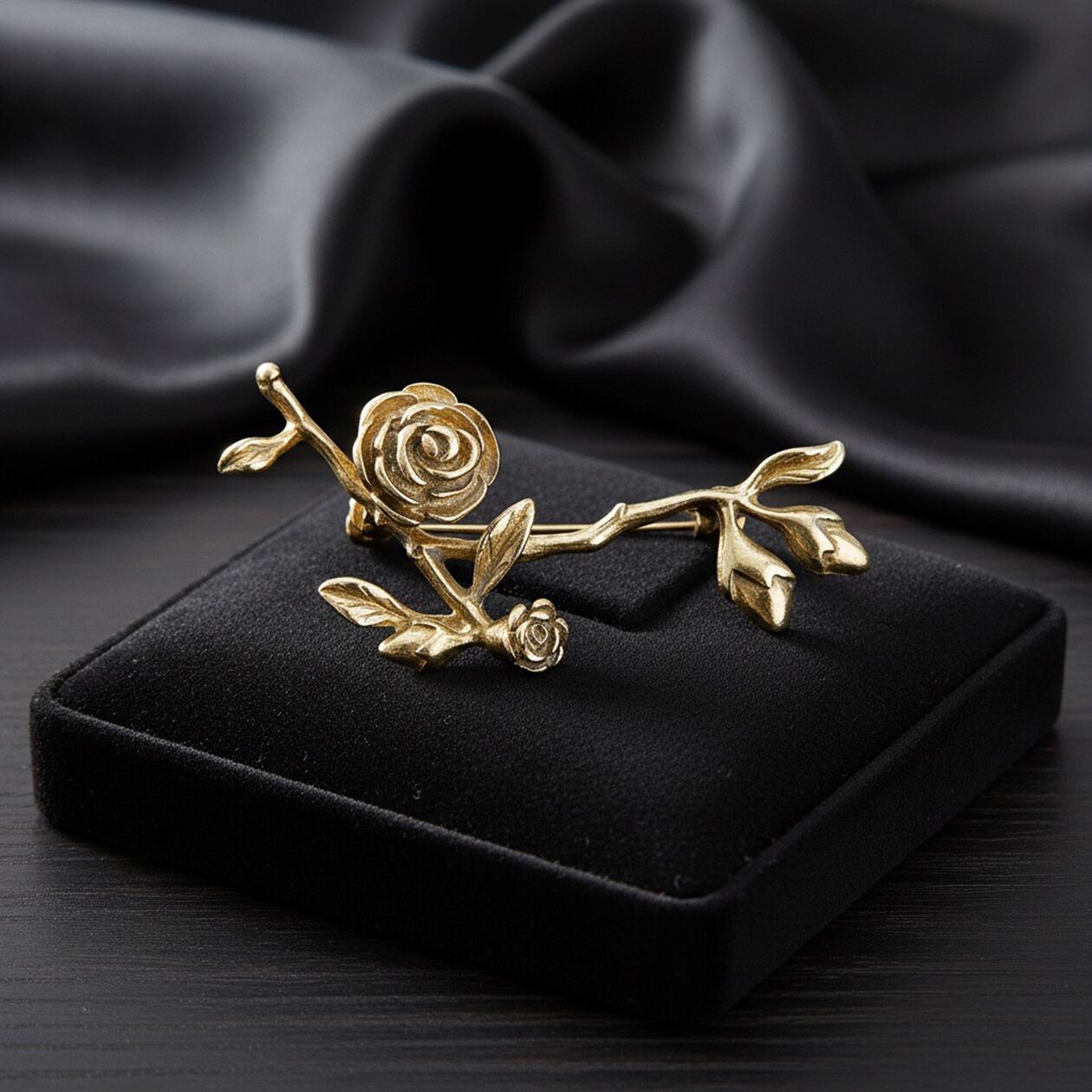 咲き誇るバラと蕾をあしらった「ローズブランチブローチ」。繊細に表現された枝や葉のディテールが、アンティーク調のゴールド仕上げで一層引き立ちます。自然美とエレガンスを融合させたデザインが、大人の女性の装いにぴったりです。フォーマルな場からカジュアルな日常まで、幅広いシーンで活躍するこのブローチは、ジャケットやストール、バッグに添えてご使用いただけます。