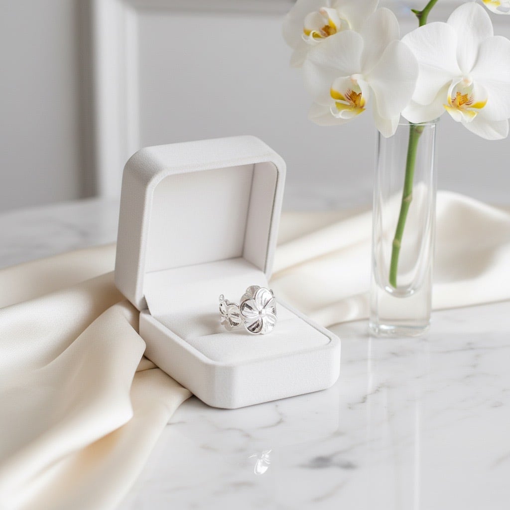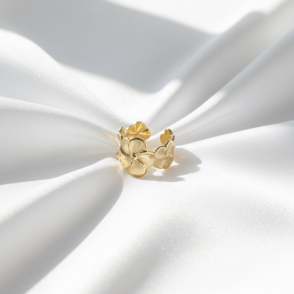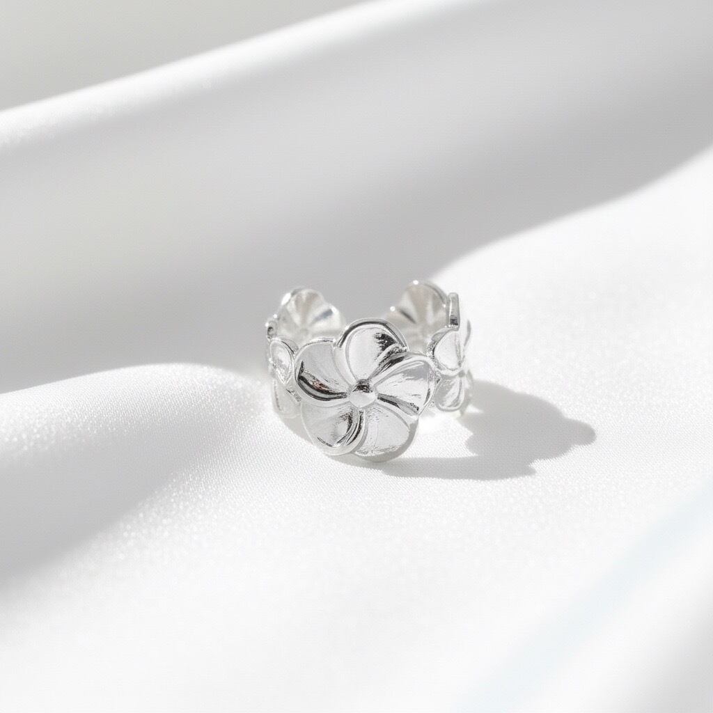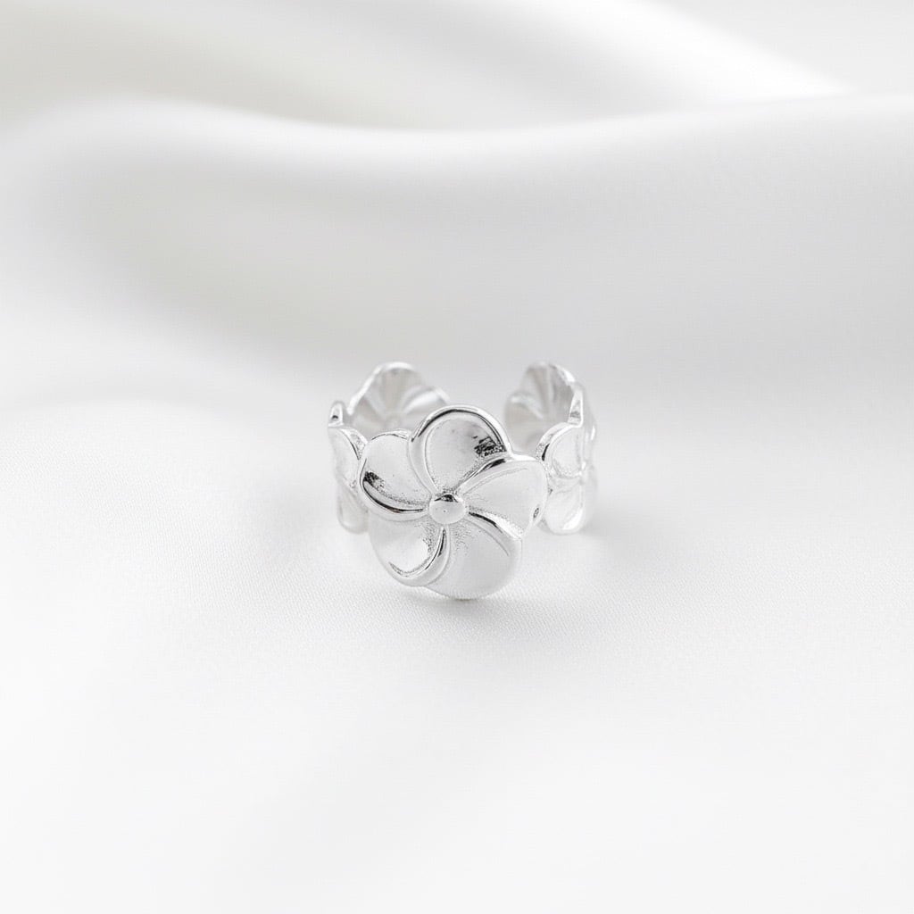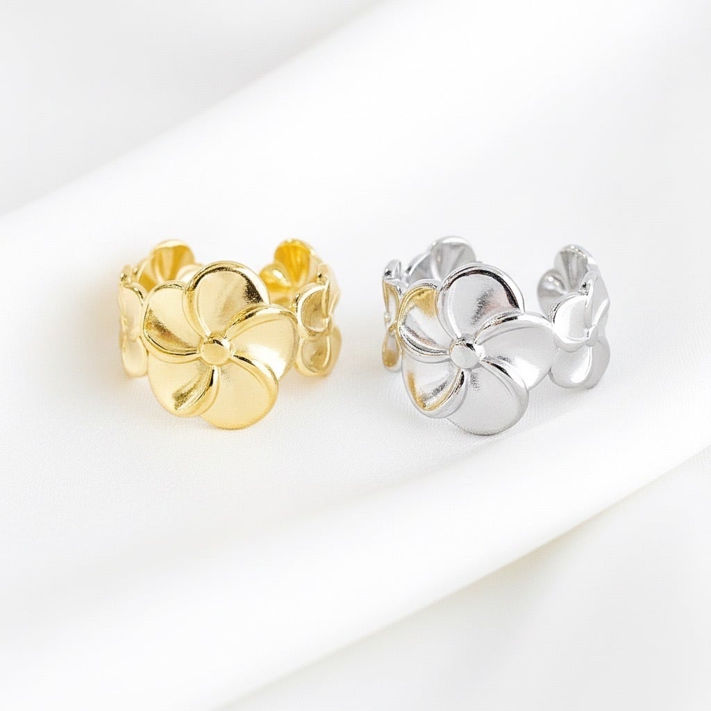 ハワイや南国で愛されるプルメリアモチーフのオープンリング。大きな花びらのデザインが印象的で、華やかさと上品さを兼ね備えた一品です。立体的なフラワーデザインは、見る角度によって異なる表情を見せ、存在感のあるアクセサリーとして活躍します。