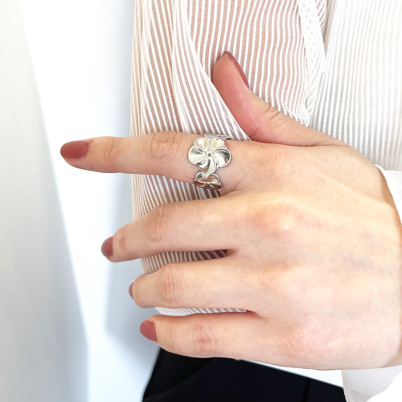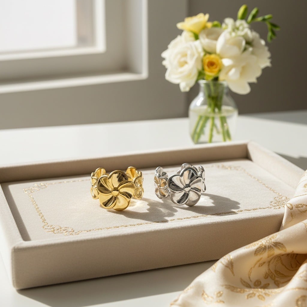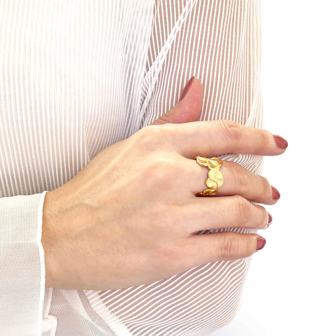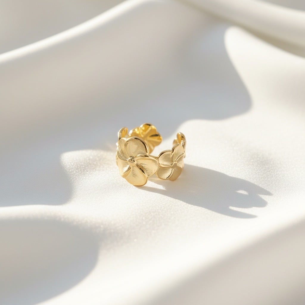 ハワイや南国で愛されるプルメリアモチーフのオープンリング。大きな花びらのデザインが印象的で、華やかさと上品さを兼ね備えた一品です。立体的なフラワーデザインは、見る角度によって異なる表情を見せ、存在感のあるアクセサリーとして活躍します。