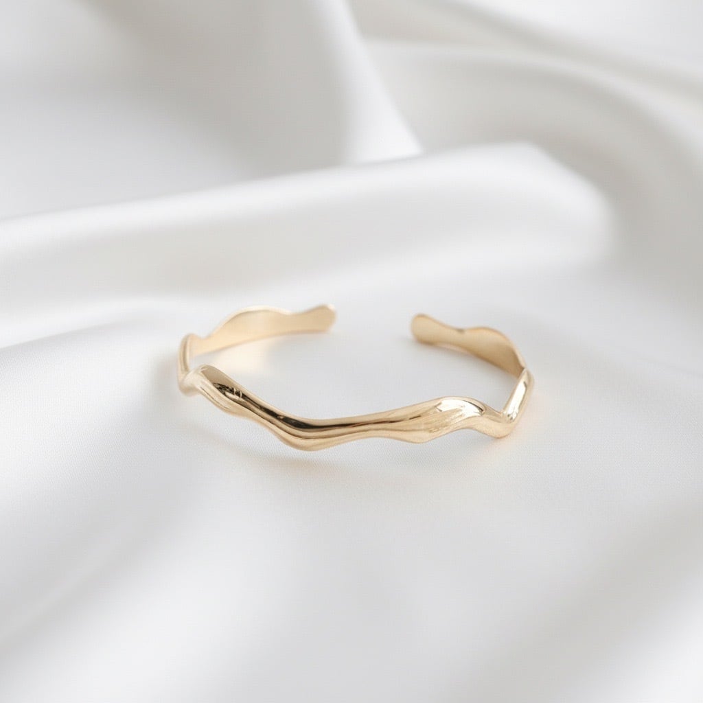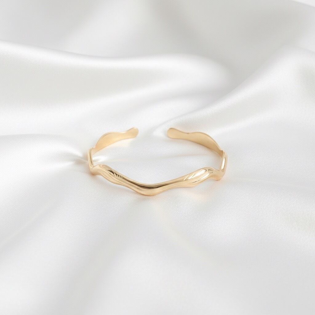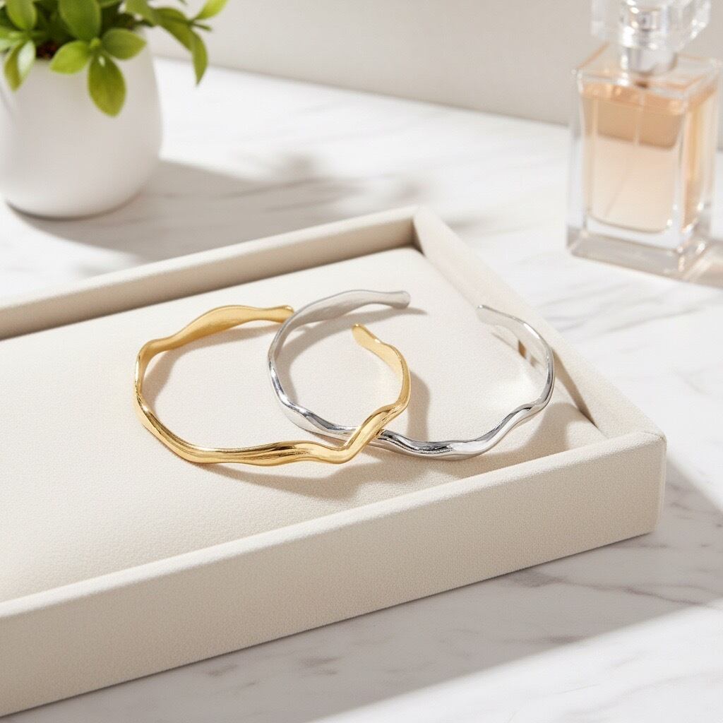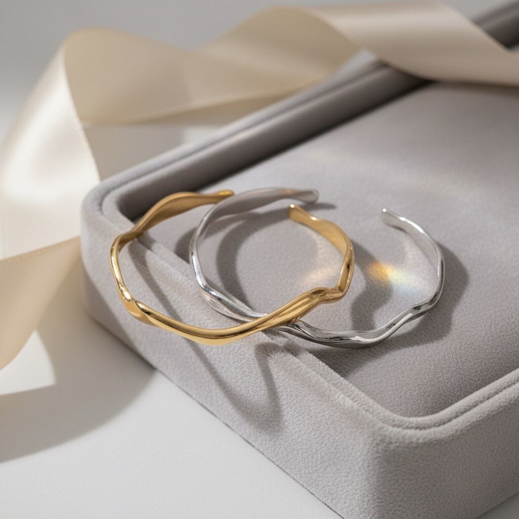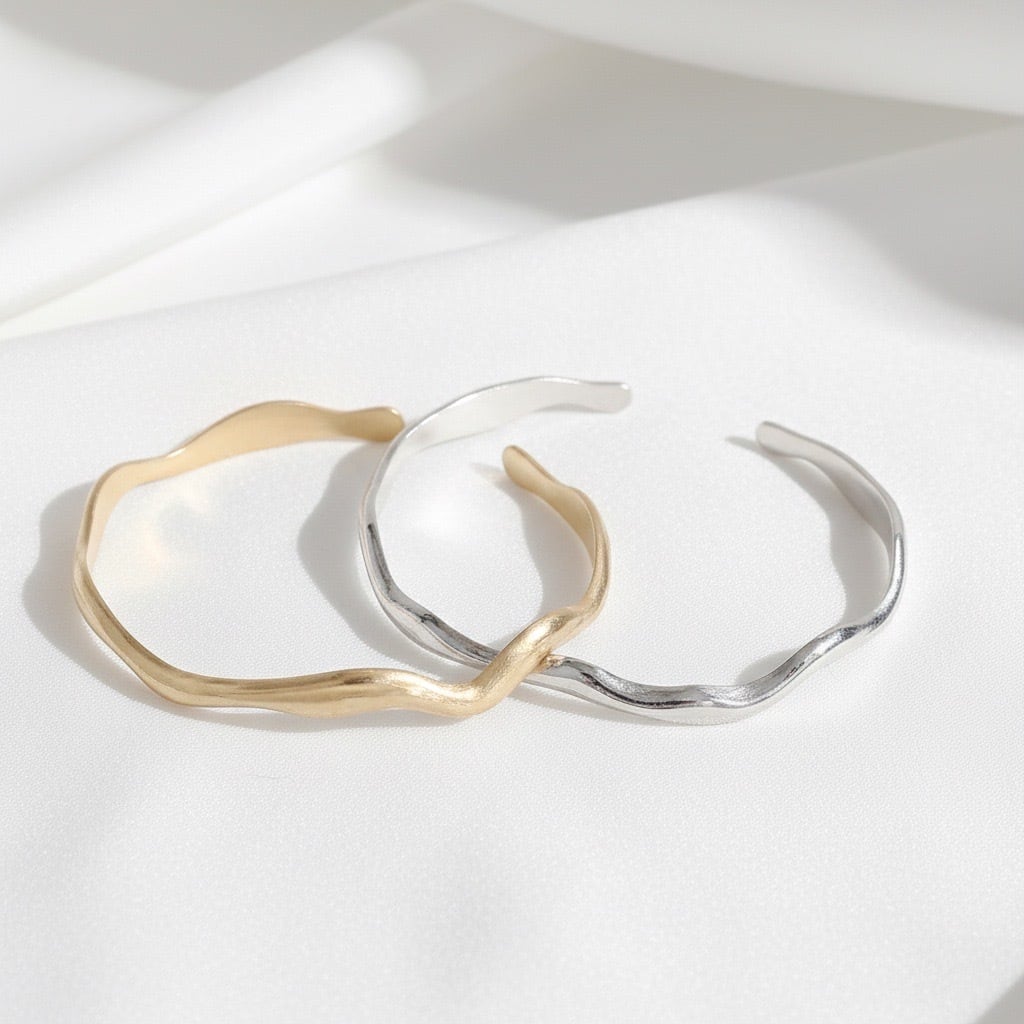 流れるような有機的なフォルムが特徴のバングル。シンプルながらもひとさじの個性を加えたデザインで、手元に程よいアクセントをプラスします。しなやかな曲線が腕に寄り添い、軽やかで快適な着け心地。単体での着用はもちろん、ほかのブレスレットや時計とのレイヤードスタイルにも馴染みやすく、日常から特別なシーンまで幅広く活躍します。